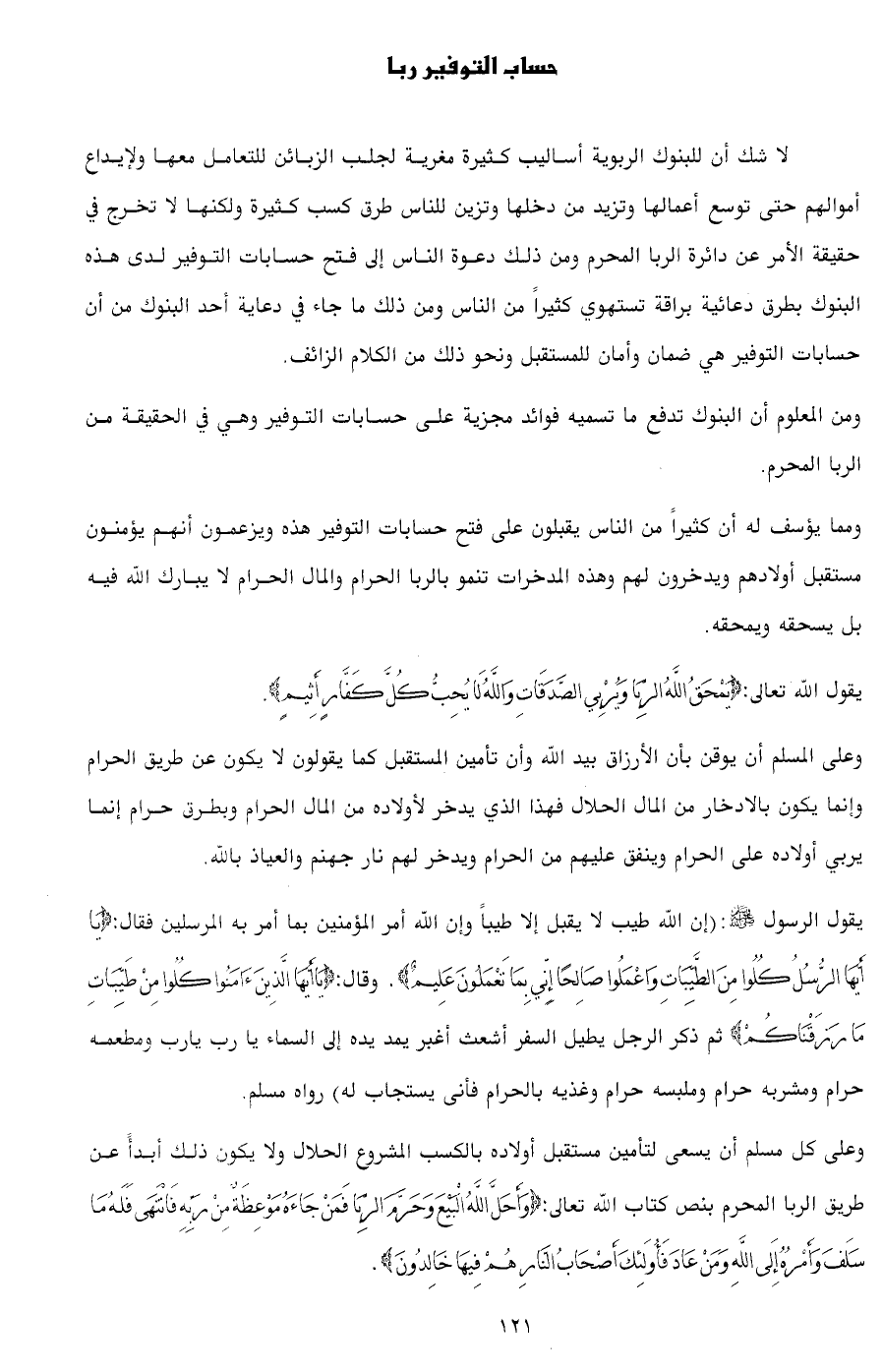 وعلى كل مسلم أن يسعى لتأمين مستقبل أولاده بالكسب المشروع الحلال ولا يكون ذلك أبدأً عن طريق الربا المحرم بنص كتاب الله تعالى: {وَأَحَلَّ اللَّهُ الْبَيْعَ وَحَرَّمَ الرِّبَا فَمَنْ جَاءَهُ مَوْعِظَةٌ مِنْ رَبِّهِ فَانْتَهَى فَلَهُ مَا سَلَفَ وَأَمْرُهُ إِلَى اللَّهِ وَمَنْ عَادَ فَأُولَئِكَ أَصْحَابُ النَّارِ هُمْ فِيهَا خَالِدُونَ}.