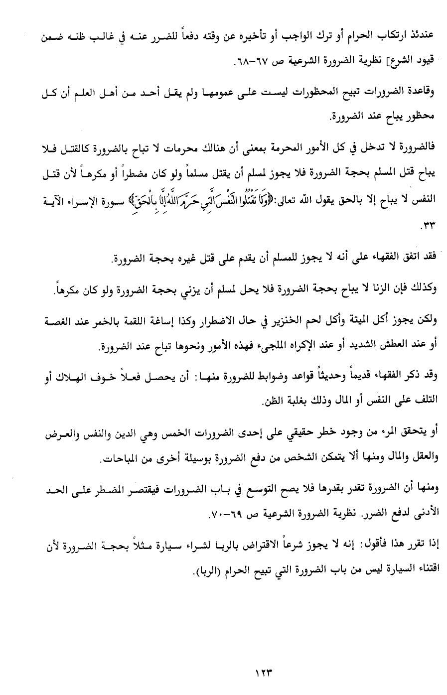 فالضرورة لا تدخل في كل الأمور المحرمة بمعنى أن هنالك محرمات لا تباح بالضرورة كالقتل فلا يباح قتل المسلم بحجة الضرورة فلا يجوز لمسلم أن يقتل مسلماً ولو كان مضطراً أو مكرهاً لأن قتل النفس لا يباح إلا بالحق يقول الله تعالى: {وَلَا تَقْتُلُوا النَّفْسَ الَّتِي حَرَّمَ اللَّهُ إِلَّا بِالْحَقِّ} سورة الإسراء الآية 33.