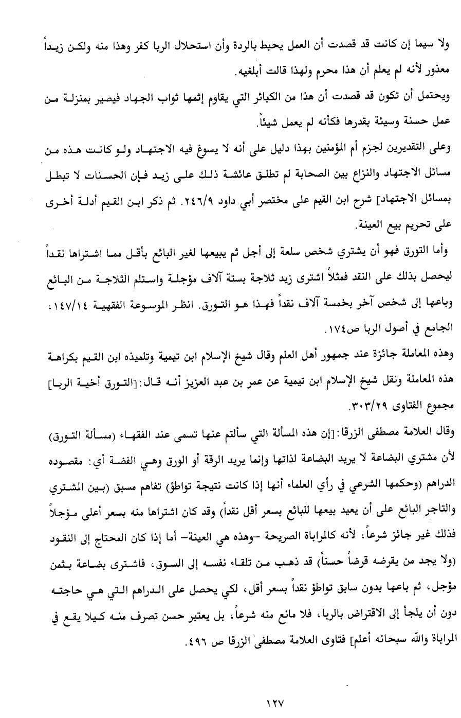 وقال العلامة مصطفى الزرقا: [إن هذه المسألة التي سألتم عنها تسمى عند الفقهاء (مسألة التورق) لأن مشتري البضاعة لا يريد البضاعة لذاتها وإنما يريد الرقة أو الورق وهي الفضة أي: مقصوده الدراهم (وحكمها الشرعي في رأي العلماء أنها إذا كانت نتيجة تواطؤ) تفاهم مسبق (بين المشتري والتاجر البائع على أن يعيد بيعها للبائع بسعر أقل نقداً) وقد كان اشتراها منه بسعر أعلى مؤجلاً فذلك غير جائز شرعاً، لأنه كالمراباة الصريحة -وهذه هي العينة- أما إذا كان المحتاج إلى النقود (ولا يجد من يقرضه قرضاً حسناً) قد ذهب من تلقاء نفسه إلى السوق، فاشترى بضاعة بثمن مؤجل، ثم باعها بدون سابق تواطؤ نقداً بسعر أقل، لكي يحصل على الدراهم التي هي حاجته دون أن يلجأ إلى الاقتراض بالربا، فلا مانع منه شرعاً، بل يعتبر حسن تصرف منه كيلا يقع في المراباة والله سبحانه أعلم] فتاوى العلامة مصطفى الزرقا ص 496.