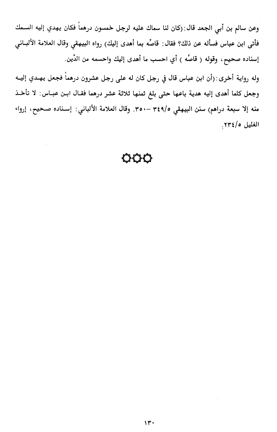 وعن سالم بن أبي الجعد قال: (كان لنا سماك عليه لرجل خمسون درهماً فكان يهدي إليه السمك فأتى ابن عباس فسأله عن ذلك؟ فقال: قاصِّه بما أهدى إليك) رواه البيهقي وقال العلامة الألباني إسناده صحيح، وقوله (قاصِّه) أي احسب ما أهدى إليك واحسمه من الدَّين.