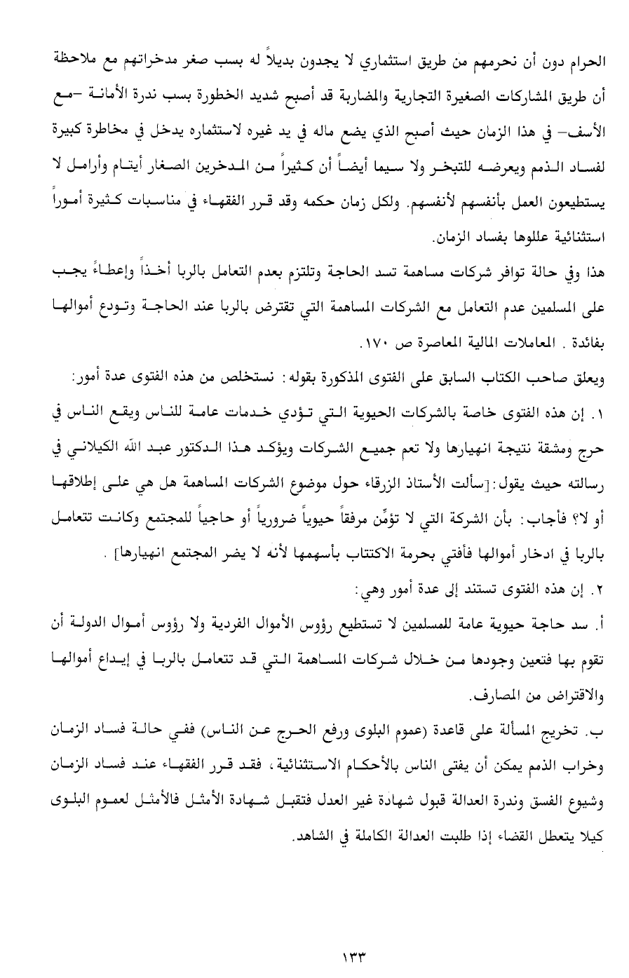 الحرام دون أن نحرمهم من طريق استثماري لا يجدون بديلاً له بسب صغر مدخراتهم مع ملاحظة أن طريق المشاركات الصغيرة التجارية والمضاربة قد أصبح شديد الخطورة بسب ندرة الأمانة -مع الأسف- في هذا الزمان حيث أصبح الذي يضع ماله في يد غيره لاستثماره يدخل في مخاطرة كبيرة لفساد الذمم ويعرضه للتبخر ولا سيما أيضاً أن كثيراً من المدخرين الصغار أيتام وأرامل لا يستطيعون العمل بأنفسهم لأنفسهم. ولكل زمان حكمه وقد قرر الفقهاء في مناسبات كثيرة أموراً استثنائية عللوها بفساد الزمان.