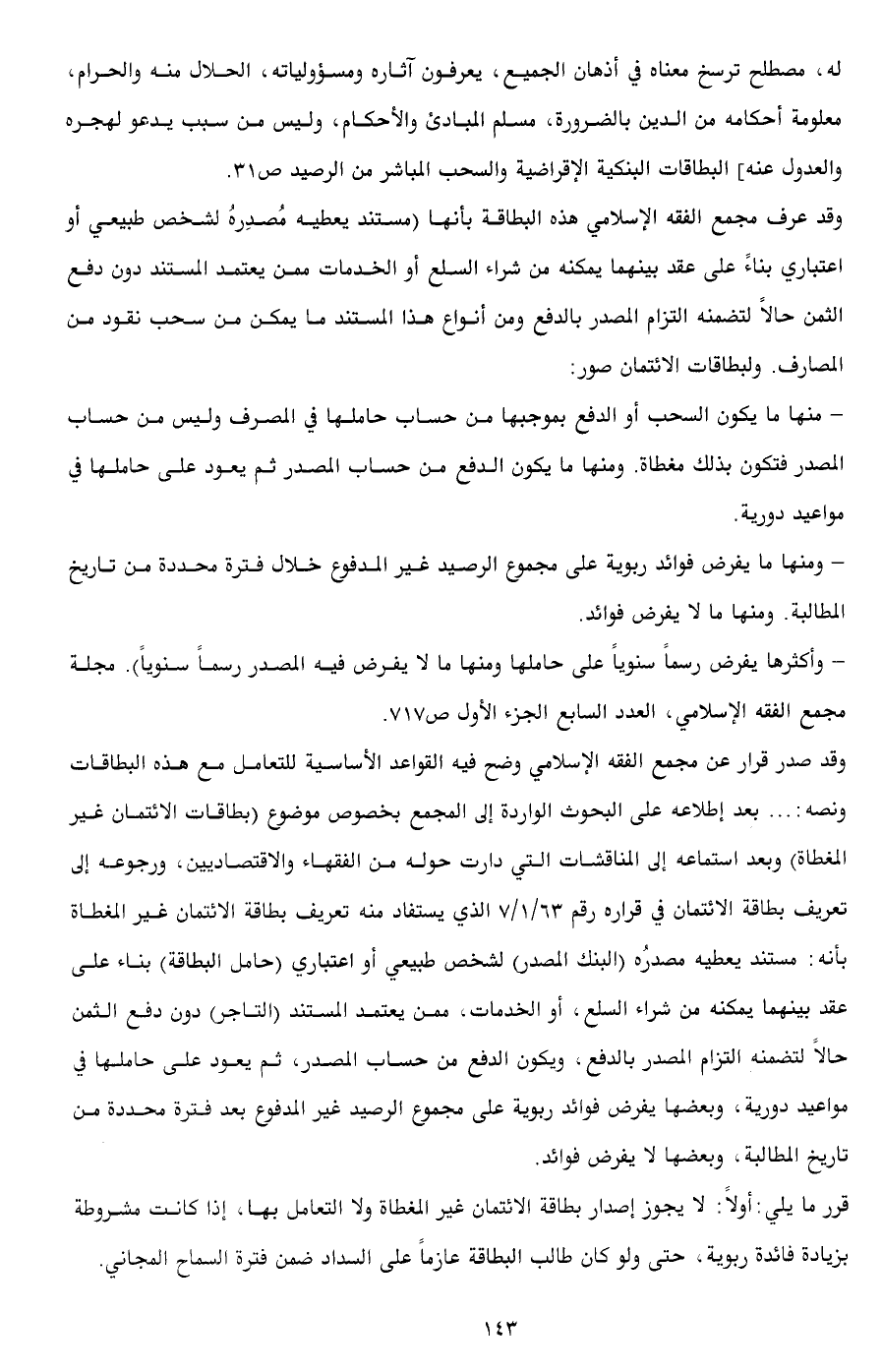 قرر ما يلي: أولاً: لا يجوز إصدار بطاقة الائتمان غير المغطاة ولا التعامل بها، إذا كانت مشروطة بزيادة فائدة ربوية، حتى ولو كان طالب البطاقة عازماً على السداد ضمن فترة السماح المجاني.