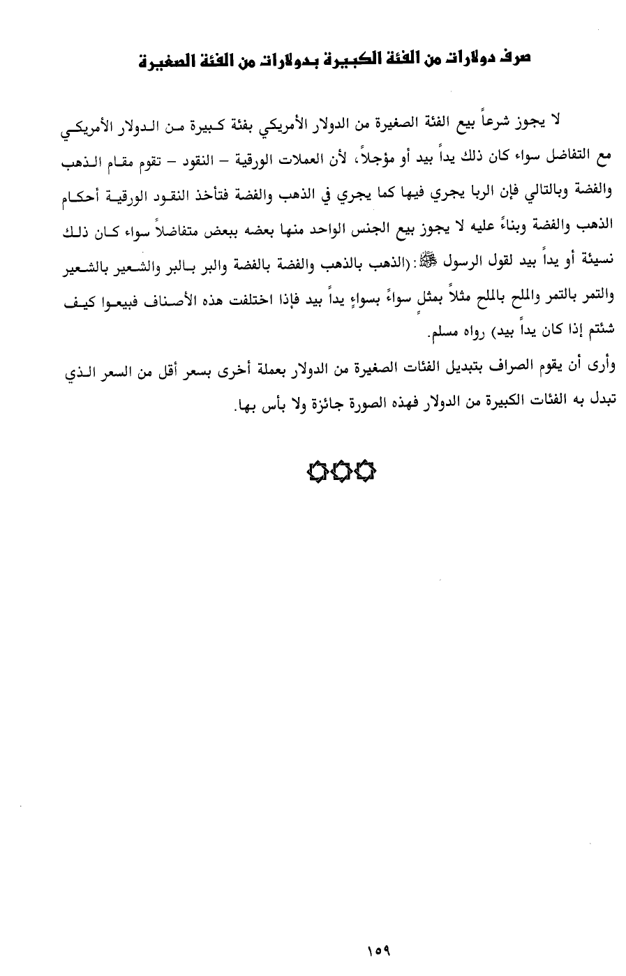 وأرى أن يقوم الصراف بتبديل الفئات الصغيرة من الدولار بعملة أخرى بسعر أقل من السعر الذي تبدل به الفئات الكبيرة من الدولار فهذه الصورة جائزة ولا بأس بها.