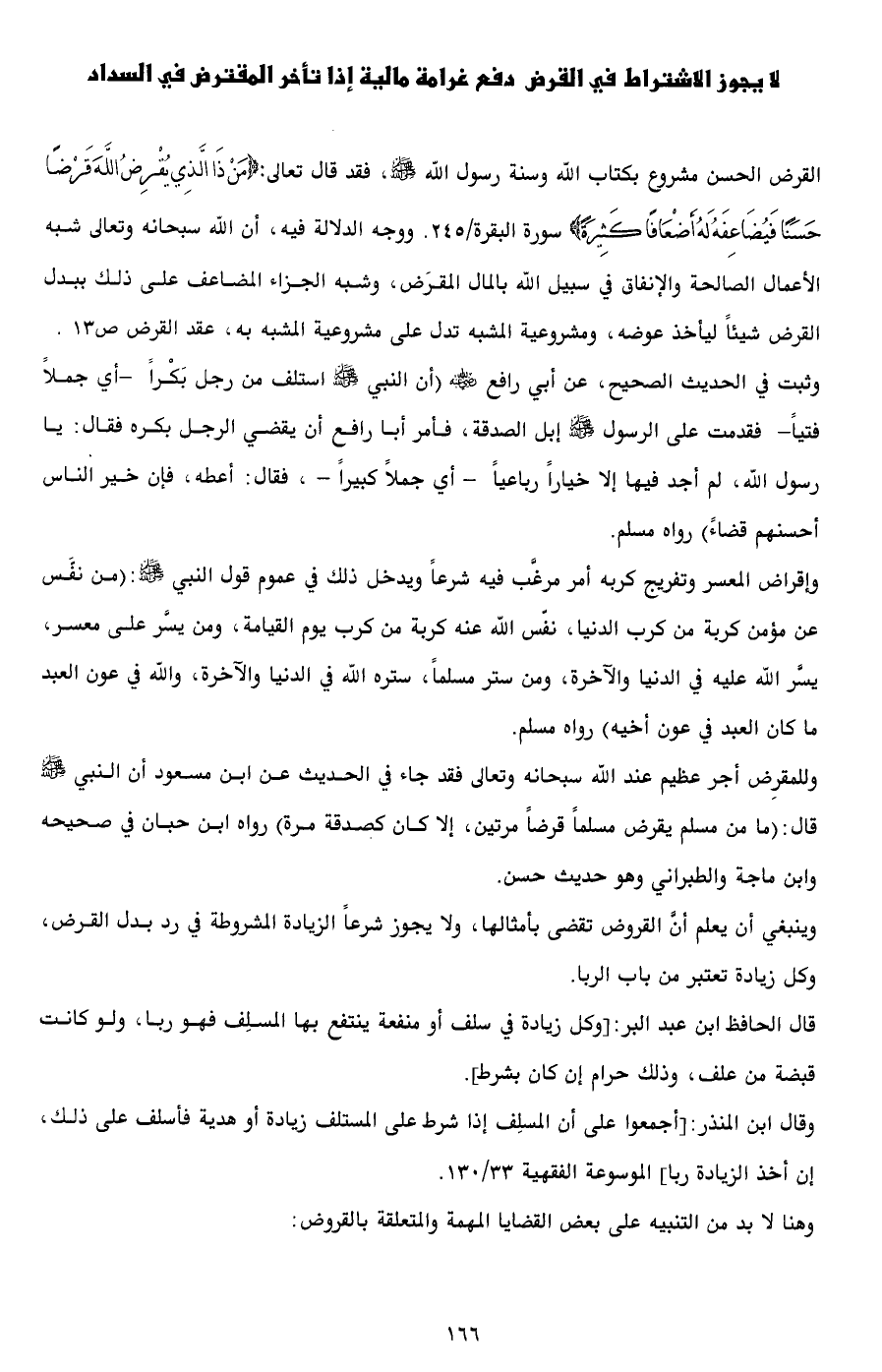 وينبغي أن يعلم أنَّ القروض تقضى بأمثالها، ولا يجوز شرعاً الزيادة المشروطة في رد بدل القرض، وكل زيادة تعتبر من باب الربا.