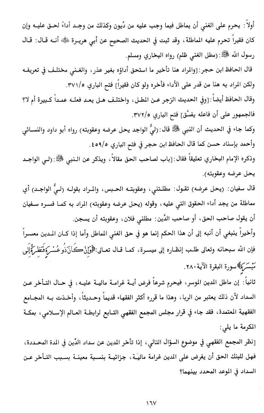 [نظر المجمع الفقهي في موضوع السؤال التالي، إذا تأخر المدين عن سداد الدَّين في المدة المحددة، فهل للبنك الحق أن يفرض على المدين غرامة مالية، جزائية بنسبة معينة بسبب التأخر عن السداد في الموعد المحدد بينهما؟