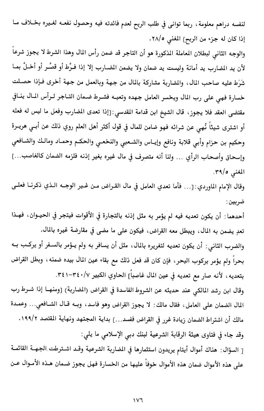 وقال ابن رشد المالكي عند حديثه عن الشروط الفاسدة في القراض (المضاربة) [ومنها إذا شرط رب المال الضمان على العامل، فقال مالك: لا يجوز القراض وهو فاسد، وبه قال الشافعي ... وعمدة مالك أن اشتراط الضمان زيادة غرر في القراض ففسد ... ] بداية المجتهد ونهاية المقتصد 2/ 199.