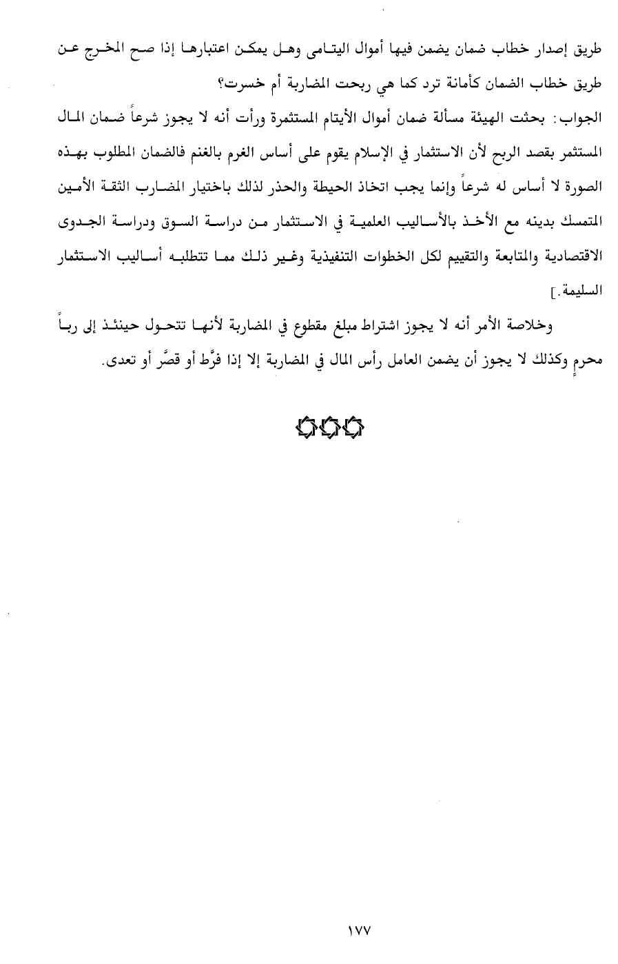الجواب: بحثت الهيئة مسألة ضمان أموال الأيتام المستثمرة ورأت أنه لا يجوز شرعاً ضمان المال المستثمر بقصد الربح لأن الاستثمار في الإسلام يقوم على أساس الغرم بالغنم فالضمان المطلوب بهذه الصورة لا أساس له شرعاً وإنما يجب اتخاذ الحيطة والحذر لذلك باختيار المضارب الثقة الأمين المتمسك بدينه مع الأخذ بالأساليب العلمية في الاستثمار من دراسة السوق ودراسة الجدوى الاقتصادية والمتابعة والتقييم لكل الخطوات التنفيذية وغير ذلك مما تتطلبه أساليب الاستثمار السليمة.]
