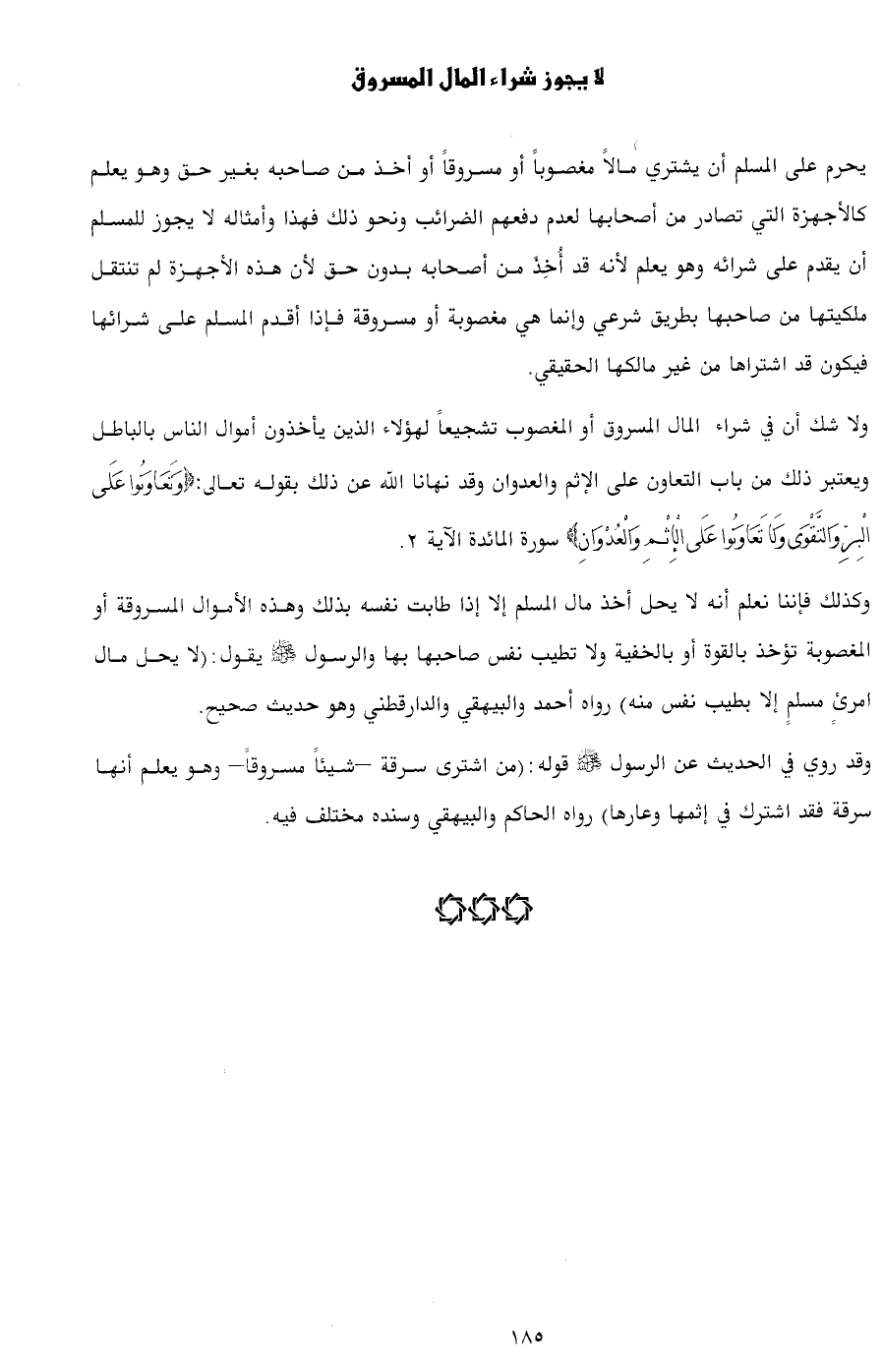 وقد روي في الحديث عن الرسول - صلى الله عليه وسلم - قوله: (من اشترى سرقة -شيئاً مسروقاً- وهو يعلم أنها سرقة فقد اشترك في إثمها وعارها) رواه الحاكم والبيهقي وسنده مختلف فيه.