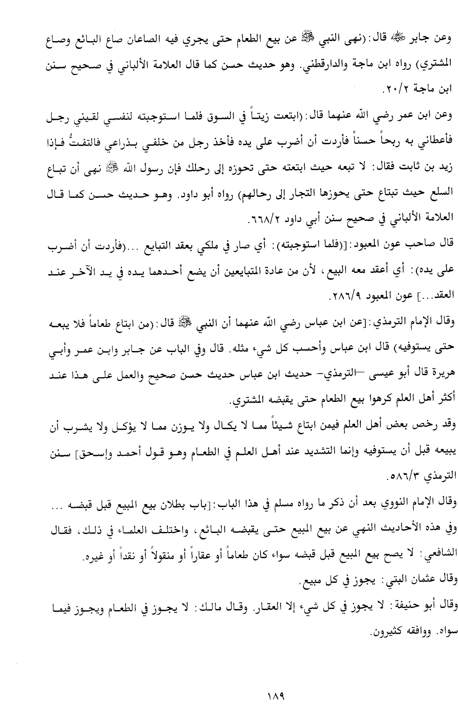 وقال الإمام الترمذي: [عن ابن عباس رضي الله عنهما أن النبي - صلى الله عليه وسلم - قال: (من ابتاع طعاماً فلا يبعه حتى يستوفيه) قال ابن عباس وأحسب كل شيء مثله. قال وفي الباب عن جابر وابن عمر وأبي هريرة قال أبو عيسى -الترمذي- حديث ابن عباس حديث حسن صحيح والعمل على هذا عند أكثر أهل العلم كرهوا بيع الطعام حتى يقبضه المشتري.