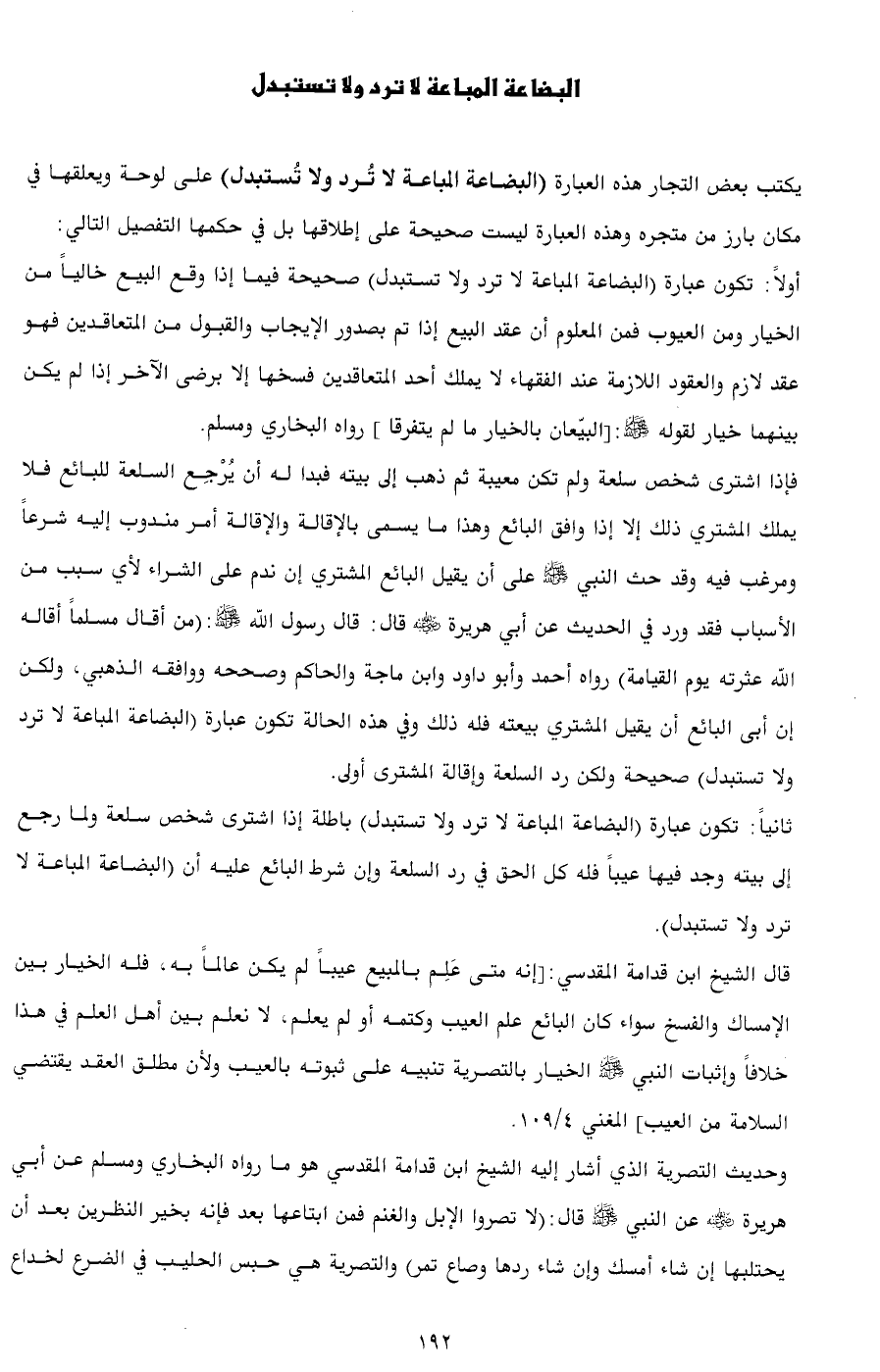يكتب بعض التجار هذه العبارة (البضاعة المباعة لا تُرد ولا تُستبدل) على لوحة ويعلقها في مكان بارز من متجره وهذه العبارة ليست صحيحة على إطلاقها بل في حكمها التفصيل التالي: