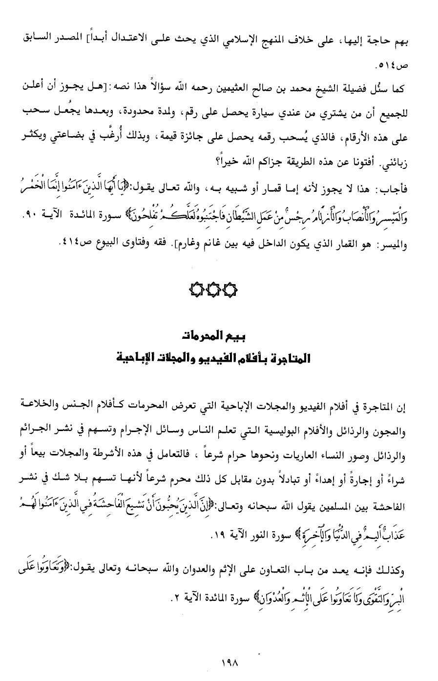 فأجاب: هذا لا يجوز لأنه إما قمار أو شبيه به، والله تعالى يقول: {يَا أَيُّهَا الَّذِينَءَامَنُوا إِنَّمَا الْخَمْرُ وَالْمَيْسِرُ وَالْأَنْصَابُ وَالْأَزْلَامُ رِجْسٌ مِنْ عَمَلِ الشَّيْطَانِ فَاجْتَنِبُوهُ لَعَلَّكُمْ تُفْلِحُونَ} سورة المائدة الآية 90. والميسر: هو القمار الذي يكون الداخل فيه بين غانم وغارم]. فقه وفتاوى البيوع ص414.