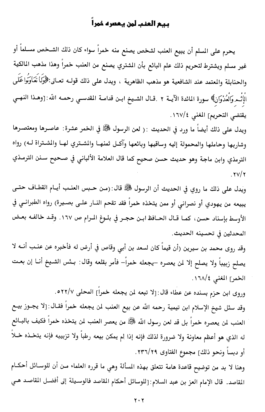 وقد سئل شيخ الإسلام ابن تيمية رحمه الله عن بيع العنب لمن يجعله خمراً فقال: [لا يجوز بيع العنب لمن يعصره خمراً بل قد لعن رسول الله - صلى الله عليه وسلم - من يعصر العنب لمن يتخذه خمراً فكيف بالبائع له الذي هو أعظم معاونة ولا ضرورة لذلك فإنه إذا لم يمكن بيعه رطباً ولا تزبيبه فإنه يتخذه خلاً أو دبساً ونحو ذلك] مجموع الفتاوى 29/ 236.