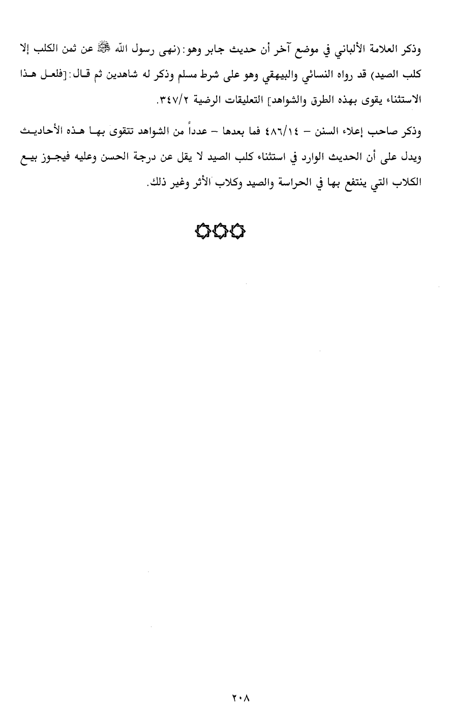 وذكر العلامة الألباني في موضع آخر أن حديث جابر وهو: (نهى رسول الله - صلى الله عليه وسلم - عن ثمن الكلب إلا كلب الصيد) قد رواه النسائي والبيهقي وهو على شرط مسلم وذكر له شاهدين ثم قال: [فلعل هذا الاستثناء يقوى بهذه الطرق والشواهد] التعليقات الرضية 2/ 347.