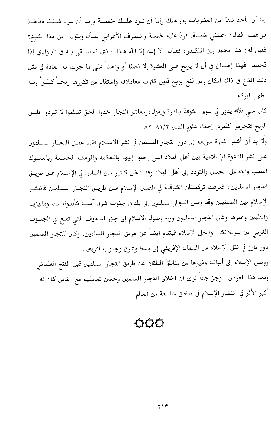 ولا بد أن أشير إشارة سريعة إلى دور التجار المسلمين في نشر الإسلام فقد عمل التجار المسلمون على نشر الدعوة الإسلامية بين أهل البلاد التي رحلوا إليها بالحكمة والموعظة الحسنة وبالسلوك الطيب والتعامل الحسن والتودد إلى أهل البلاد وقد دخل كثير من الناس في الإسلام عن طريق التجار المسلمين، فعرفت تركستان الشرقية في الصين الإسلام عن طريق التجار المسلمين فانتشر الإسلام بين الصينيين وقد وصل التجار المسلمون إلى بلدان جنوب شرق آسيا كأندونيسيا وماليزيا والفلبين وغيرها وكان التجار المسلمون وراء وصول الإسلام إلى جزر المالديف التي تقع في الجنوب الغربي من سريلانكا، ودخل الإسلام فيتنام أيضاً عن طريق التجار المسلمين. وكان للتجار المسلمين دور بارز في نقل الإسلام من الشمال الإفريقي إلى وسط وشرق وجنوب إفريقيا.
