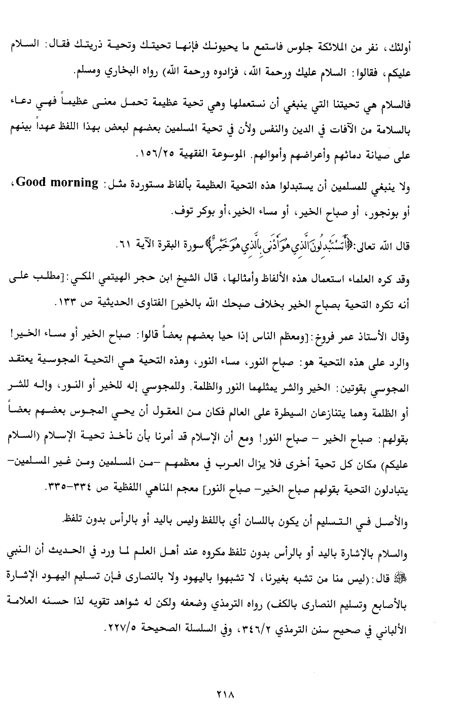 ولا ينبغي للمسلمين أن يستبدلوا هذه التحية العظيمة بألفاظ مستوردة مثل: Good morning، أو بونجور، أو صباح الخير، أو مساء الخير، أو بوكر توف.