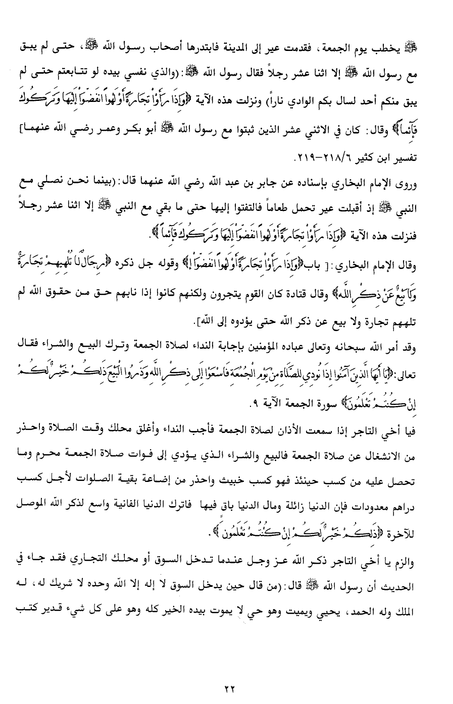 - صلى الله عليه وسلم - يخطب يوم الجمعة, فقدمت عير إلى المدينة فابتدرها أصحاب رسول الله - صلى الله عليه وسلم - , حتى لم يبق مع رسول الله - صلى الله عليه وسلم - إلا اثنا عشر رجلاً فقال رسول الله - صلى الله عليه وسلم -: (والذي نفسي بيده لو تتابعتم حتى لم يبق منكم أحد لسال بكم الوادي ناراً) ونزلت هذه الآية {وَإِذَا رَأَوْاْ تِجَارَةً أَوْ لَهْواً انفَضّوَاْ إِلَيْهَا وَتَرَكُوكَ قَآئِماً} وقال: كان في الاثني عشر الذين ثبتوا مع رسول الله - صلى الله عليه وسلم - أبو بكر وعمر رضي الله عنهما] تفسير ابن كثير 6/ 218 - 219.