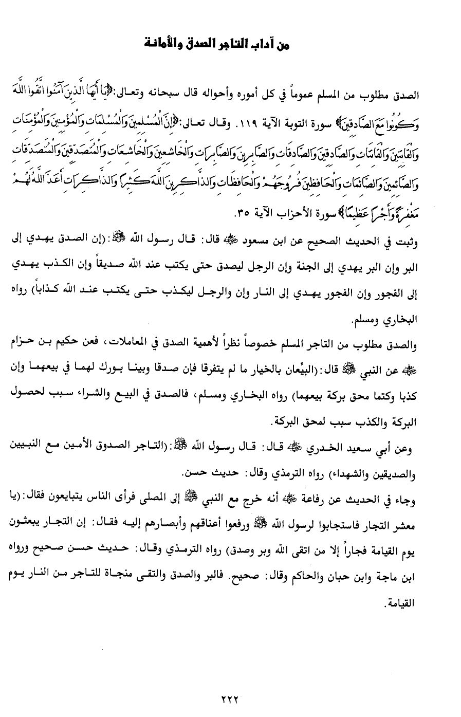 وجاء في الحديث عن رفاعة - رضي الله عنه - أنه خرج مع النبي - صلى الله عليه وسلم - إلى المصلى فرأى الناس يتبايعون فقال: (يا معشر التجار فاستجابوا لرسول الله - صلى الله عليه وسلم - ورفعوا أعناقهم وأبصارهم إليه فقال: إن التجار يبعثون يوم القيامة فجاراً إلا من اتقى الله وبر وصدق) رواه الترمذي وقال: حديث حسن صحيح ورواه ابن ماجة وابن حبان والحاكم وقال: صحيح. فالبر والصدق والتقى منجاة للتاجر من النار يوم القيامة.