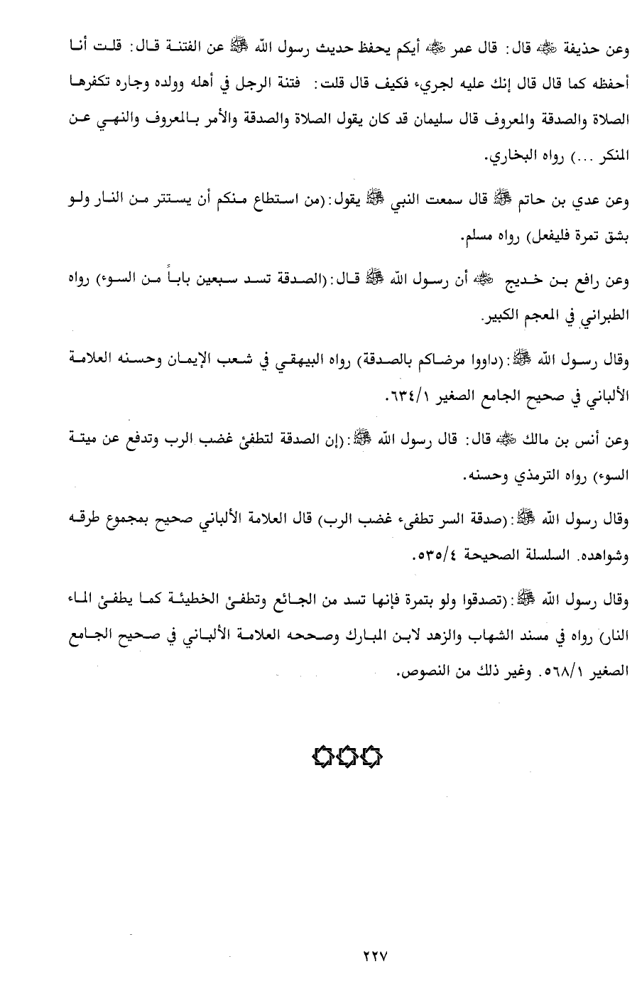 وعن حذيفة - رضي الله عنه - قال: قال عمر - رضي الله عنه - أيكم يحفظ حديث رسول الله - صلى الله عليه وسلم - عن الفتنة قال: قلت أنا أحفظه كما قال قال إنك عليه لجريء فكيف قال قلت: فتنة الرجل في أهله وولده وجاره تكفرها الصلاة والصدقة والمعروف قال سليمان قد كان يقول الصلاة والصدقة والأمر بالمعروف والنهي عن المنكر ... ) رواه البخاري.