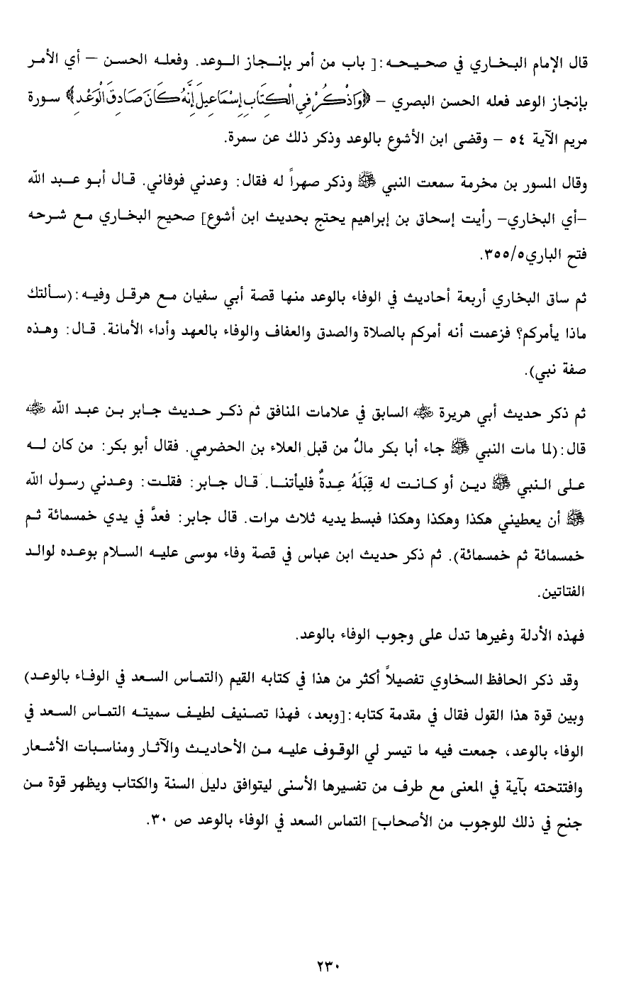 ثم ذكر حديث أبي هريرة - رضي الله عنه - السابق في علامات المنافق ثم ذكر حديث جابر بن عبد الله - رضي الله عنه - قال: (لما مات النبي - صلى الله عليه وسلم - جاء أبا بكر مالٌ من قبل العلاء بن الحضرمي. فقال أبو بكر: من كان له على النبي - صلى الله عليه وسلم - دين أو كانت له قِبَلَهُ عِدةٌ فليأتنا. قال جابر: فقلت: وعدني رسول الله ... - صلى الله عليه وسلم - أن يعطيني هكذا وهكذا وهكذا فبسط يديه ثلاث مرات. قال جابر: فعدَّ في يدي خمسمائة ثم خمسمائة ثم خمسمائة). ثم ذكر حديث ابن عباس في قصة وفاء موسى عليه السلام بوعده لوالد الفتاتين.
