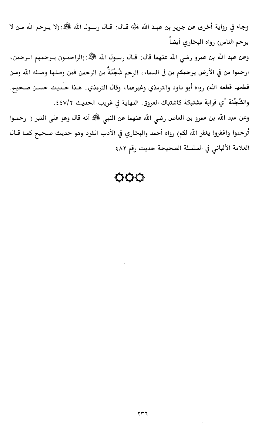 وعن عبد الله بن عمرو رضي الله عنهما قال: قال رسول الله - صلى الله عليه وسلم -: (الراحمون يرحمهم الرحمن، ارحموا من في الأرض يرحمكم من في السماء، الرحم شُجْنَةٌ من الرحمن فمن وصلها وصله الله ومن قطعها قطعه الله) رواه أبو داود والترمذي وغيرهما، وقال الترمذي: هذا حديث حسن صحيح. والشُجْنة أي قرابة مشتبكة كاشتباك العروق. النهاية في غريب الحديث 2/ 447.