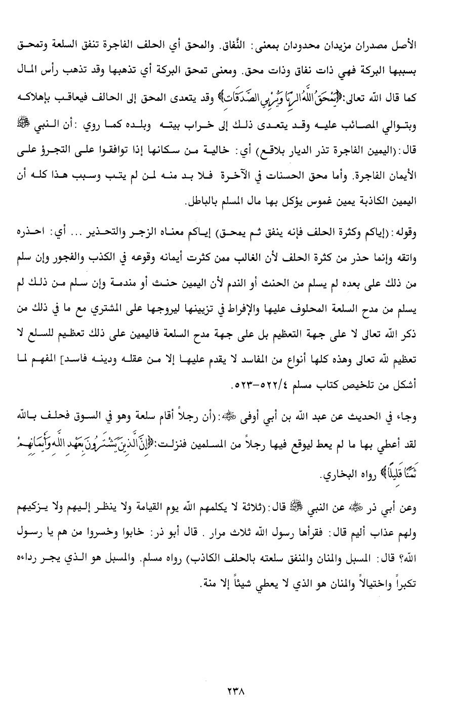 وقوله: (إياكم وكثرة الحلف فإنه ينفق ثم يمحق) إياكم معناه الزجر والتحذير ... أي: احذره واتقه وإنما حذر من كثرة الحلف لأن الغالب ممن كثرت أيمانه وقوعه في الكذب والفجور وإن سلم من ذلك على بعده لم يسلم من الحنث أو الندم لأن اليمين حنث أو مندمة وإن سلم من ذلك لم يسلم من مدح السلعة المحلوف عليها والإفراط في تزيينها ليروجها على المشتري مع ما في ذلك من ذكر الله تعالى لا على جهة التعظيم بل على جهة مدح السلعة فاليمين على ذلك تعظيم للسلع لا تعظيم لله تعالى وهذه كلها أنواع من المفاسد لا يقدم عليها إلا من عقله ودينه فاسد] المفهم لما أشكل من تلخيص كتاب مسلم 4/ 522 - 523.