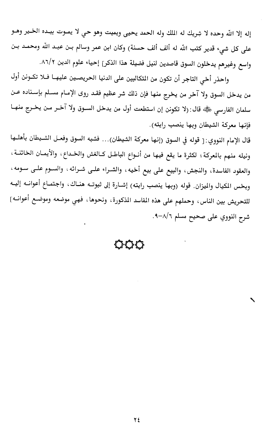 إله إلا الله وحده لا شريك له الملك وله الحمد يحيى ويميت وهو حي لا يموت بيده الخير وهو على كل شيء قدير كتب الله له ألف ألف حسنة) وكان ابن عمر وسالم بن عبد الله ومحمد بن واسع وغيرهم يدخلون السوق قاصدين لنيل فضيلة هذا الذكر] إحياء علوم الدين 2/ 86.