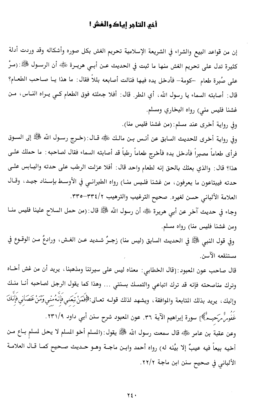 وعن عقبة بن عامر - رضي الله عنه - قال سمعت رسول الله - صلى الله عليه وسلم - يقول: (المسلم أخو المسلم لا يحل لمسلمٍ باع من أخيه بيعاً فيه عيبٌ إلا بيَّنه له) رواه أحمد وابن ماجة وهو حديث صحيح كما قال العلامة الألباني في صحيح سنن ابن ماجة 2/ 22.