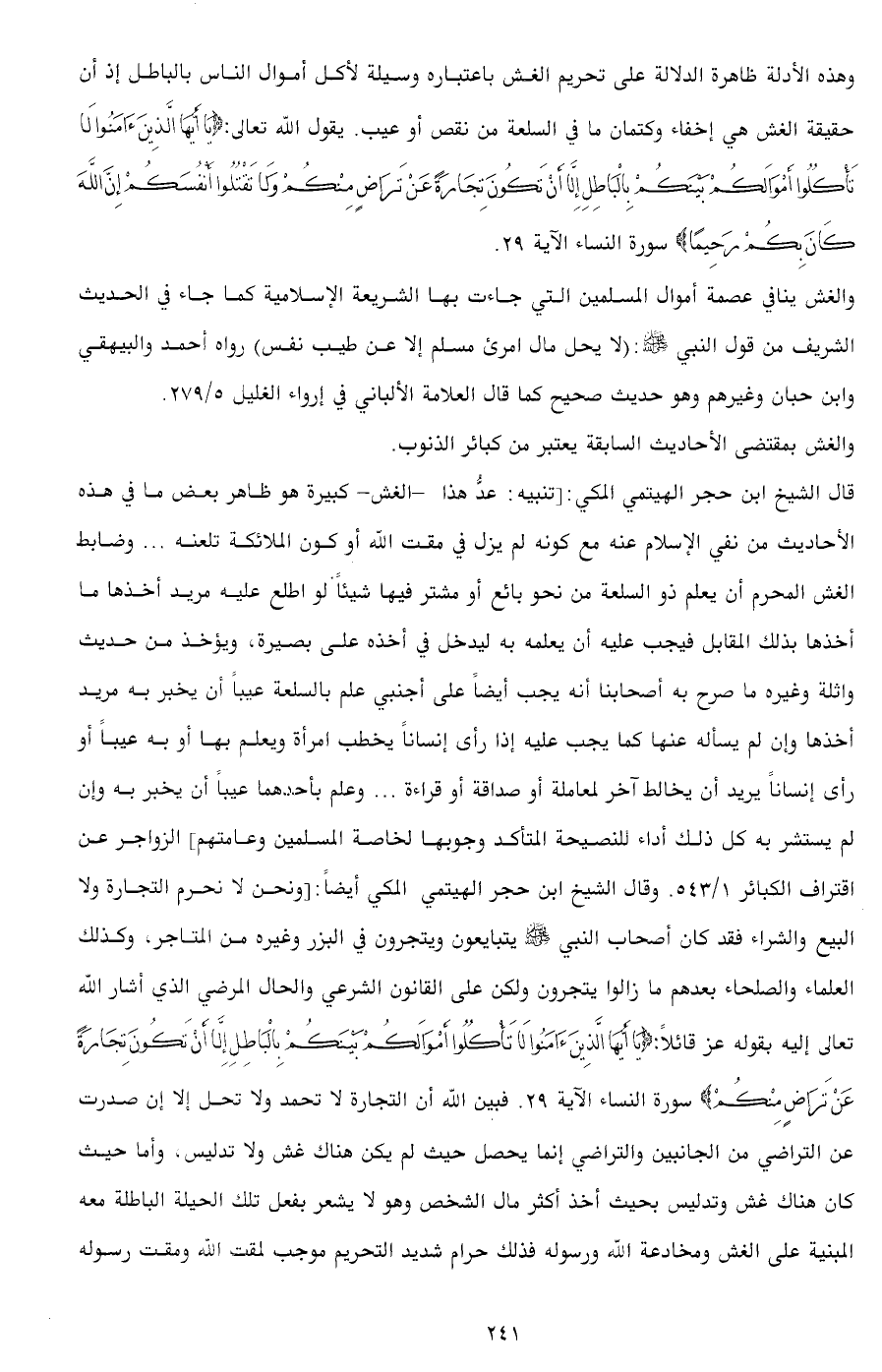 قال الشيخ ابن حجر الهيتمي المكي: [تنبيه: عدُّ هذا -الغش- كبيرة هو ظاهر بعض ما في هذه الأحاديث من نفي الإسلام عنه مع كونه لم يزل في مقت الله أو كون الملائكة تلعنه ... وضابط الغش المحرم أن يعلم ذو السلعة من نحو بائع أو مشتر فيها شيئاً لو اطلع عليه مريد أخذها ما أخذها بذلك المقابل فيجب عليه أن يعلمه به ليدخل في أخذه على بصيرة، ويؤخذ من حديث واثلة وغيره ما صرح به أصحابنا أنه يجب أيضاً على أجنبي علم بالسلعة عيباً أن يخبر به مريد أخذها وإن لم يسأله عنها كما يجب عليه إذا رأى إنساناً يخطب امرأة ويعلم بها أو به عيباً أو رأى إنساناً يريد أن يخالط آخر لمعاملة أو صداقة أو قراءة ... وعلم بأحدهما عيباً أن يخبر به وإن لم يستشر به كل ذلك أداء للنصيحة المتأكد وجوبها لخاصة المسلمين وعامتهم] الزواجر عن اقتراف الكبائر 1/ 543. وقال الشيخ ابن حجر الهيتمي المكي أيضاً: [ونحن لا نحرم التجارة ولا البيع والشراء فقد كان أصحاب النبي - صلى الله عليه وسلم - يتبايعون ويتجرون في البزر وغيره من المتاجر، وكذلك العلماء والصلحاء بعدهم ما زالوا يتجرون ولكن على القانون الشرعي والحال المرضي الذي أشار الله تعالى إليه بقوله عز قائلاً: {يَا أَيُّهَا الَّذِينَءَامَنُوا لَا تَأْكُلُوا أَمْوَالَكُمْ بَيْنَكُمْ بِالْبَاطِلِ إِلَّا أَنْ تَكُونَ تِجَارَةً عَنْ تَرَاضٍ مِنْكُمْ} سورة النساء الآية 29. فبين الله أن التجارة لا تحمد ولا تحل إلا إن صدرت عن التراضي من الجانبين والتراضي إنما يحصل حيث لم يكن هناك غش ولا تدليس، وأما حيث كان هناك غش وتدليس بحيث أخذ أكثر مال الشخص وهو لا يشعر بفعل تلك الحيلة الباطلة معه المبنية على الغش ومخادعة الله ورسوله فذلك حرام شديد التحريم موجب لمقت الله ومقت رسوله