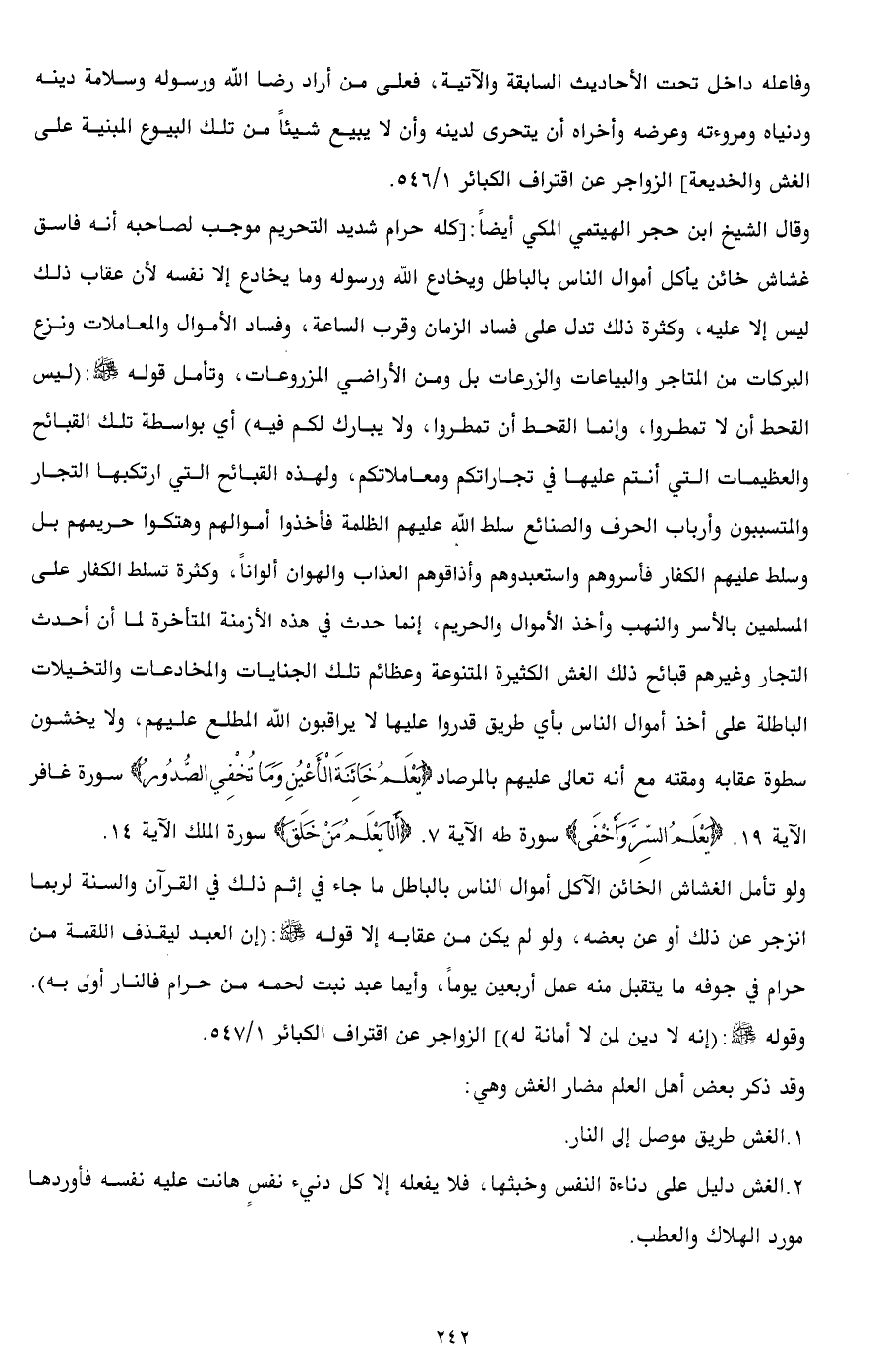 وقال الشيخ ابن حجر الهيتمي المكي أيضاً: [كله حرام شديد التحريم موجب لصاحبه أنه فاسق غشاش خائن يأكل أموال الناس بالباطل ويخادع الله ورسوله وما يخادع إلا نفسه لأن عقاب ذلك ليس إلا عليه، وكثرة ذلك تدل على فساد الزمان وقرب الساعة، وفساد الأموال والمعاملات ونزع البركات من المتاجر والبياعات والزرعات بل ومن الأراضي المزروعات، وتأمل قوله - صلى الله عليه وسلم -: (ليس القحط أن لا تمطروا، وإنما القحط أن تمطروا، ولا يبارك لكم فيه) أي بواسطة تلك القبائح والعظيمات التي أنتم عليها في تجاراتكم ومعاملاتكم، ولهذه القبائح التي ارتكبها التجار والمتسببون وأرباب الحرف والصنائع سلط الله عليهم الظلمة فأخذوا أموالهم وهتكوا حريمهم بل وسلط عليهم الكفار فأسروهم واستعبدوهم وأذاقوهم العذاب والهوان ألواناً، وكثرة تسلط الكفار على المسلمين بالأسر والنهب وأخذ الأموال والحريم، إنما حدث في هذه الأزمنة المتأخرة لما أن أحدث التجار وغيرهم قبائح ذلك الغش الكثيرة المتنوعة وعظائم تلك الجنايات والمخادعات والتخيلات الباطلة على أخذ أموال الناس بأي طريق قدروا عليها لا يراقبون الله المطلع عليهم، ولا يخشون سطوة عقابه ومقته مع أنه تعالى عليهم بالمرصاد {يَعْلَمُ خَائِنَةَ الْأَعْيُنِ وَمَا تُخْفِي الصُّدُورُ} سورة غافر الآية 19. {يَعْلَمُ السِّرَّ وَأَخْفَى} سورة طه الآية 7. {أَلَا يَعْلَمُ مَنْ خَلَقَ} سورة الملك الآية 14.