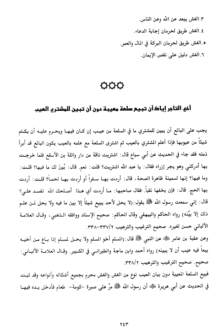 وعن عقبة بن عامر - رضي الله عنه - عن النبي - صلى الله عليه وسلم - قال: (المسلم أخو المسلم ولا يحل لمسلم إذا باع من أخيه بيعاً فيه عيب أن لا يبينه) رواه أحمد وابن ماجة والطبراني في الكبير. وقال العلامة الألباني: صحيح. صحيح الترغيب والترهيب 2/ 338.