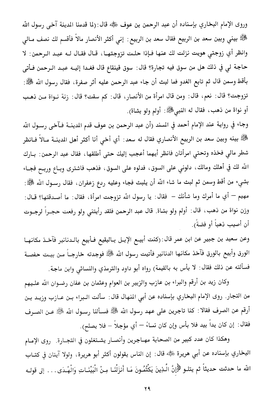 وهكذا كان عدد كبير من الصحابة مهاجرين وأنصار يشتغلون في التجارة. روى الإمام البخاري بإسناده عن أبي هريرة - رضي الله عنه - قال: إن الناس يقولون أكثر أبو هريرة، ولولا آيتان في كتاب الله ما حدثت حديثاً ثم يتلو {إِنَّ الَّذِينَ يَكْتُمُونَ مَا أَنزَلْنَا مِنْ الْبَيِّنَاتِ وَالْهُدَى ... إلى قوله