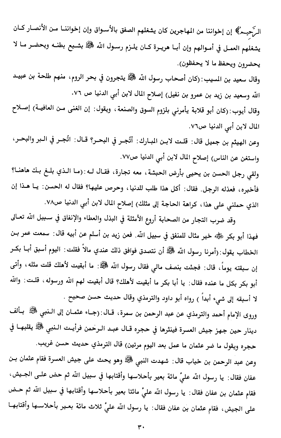 وقال سعيد بن المسيب: (كان أصحاب رسول الله - صلى الله عليه وسلم - يتجرون في بحر الروم، منهم طلحة بن عبيد الله وسعيد بن زيد بن عمرو بن نفيل) إصلاح المال لابن أبي الدنيا ص 76.