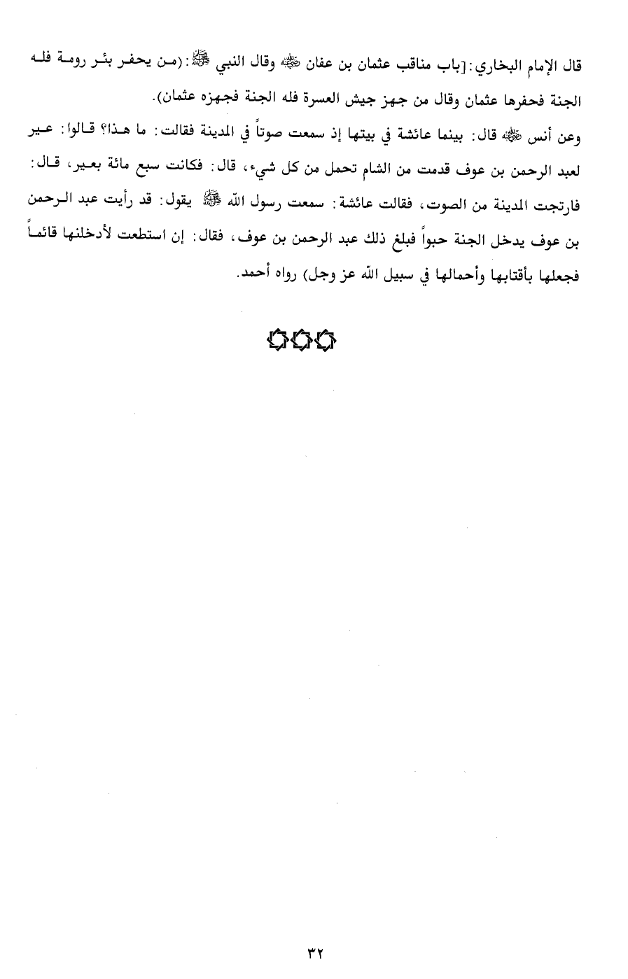 قال الإمام البخاري: [باب مناقب عثمان بن عفان - رضي الله عنه - وقال النبي - صلى الله عليه وسلم -: (من يحفر بئر رومة فله الجنة فحفرها عثمان وقال من جهز جيش العسرة فله الجنة فجهزه عثمان).