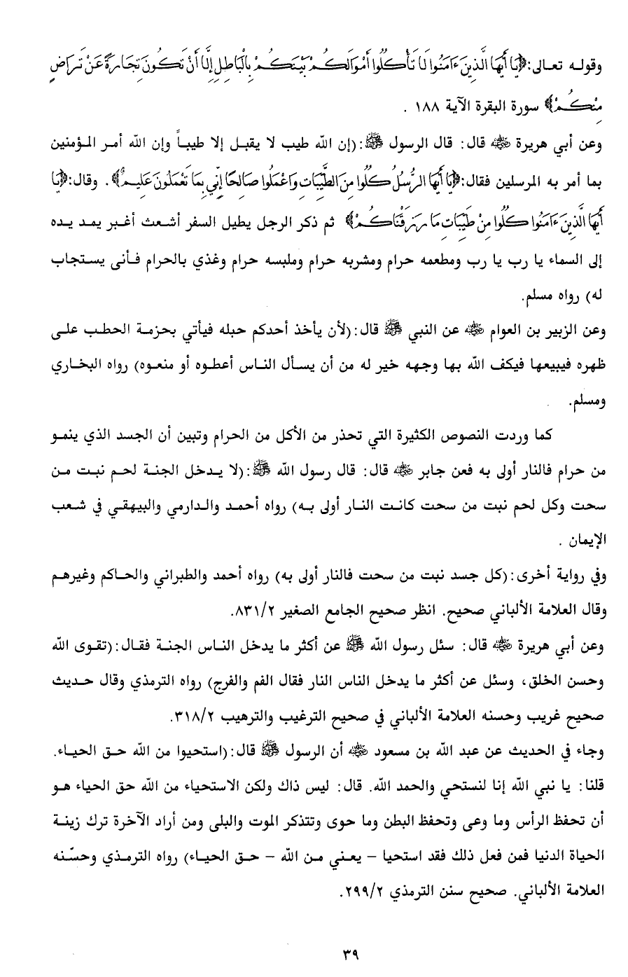وعن أبي هريرة - رضي الله عنه - قال: قال الرسول - صلى الله عليه وسلم -: (إن الله طيب لا يقبل إلا طيباً وإن الله أمر المؤمنين بما أمر به المرسلين فقال: {يَا أَيُّهَا الرُّسُلُ كُلُوا مِنَ الطَّيِّبَاتِ وَاعْمَلُوا صَالِحًا إِنِّي بِمَا تَعْمَلُونَ عَلِيمٌ}. وقال: {يَا أَيُّهَا الَّذِينَءَامَنُوا كُلُوا مِنْ طَيِّبَاتِ مَا رَزَقْنَاكُمْ} ثم ذكر الرجل يطيل السفر أشعث أغبر يمد يده إلى السماء يا رب يا رب ومطعمه حرام ومشربه حرام وملبسه حرام وغذي بالحرام فأنى يستجاب له) رواه مسلم.