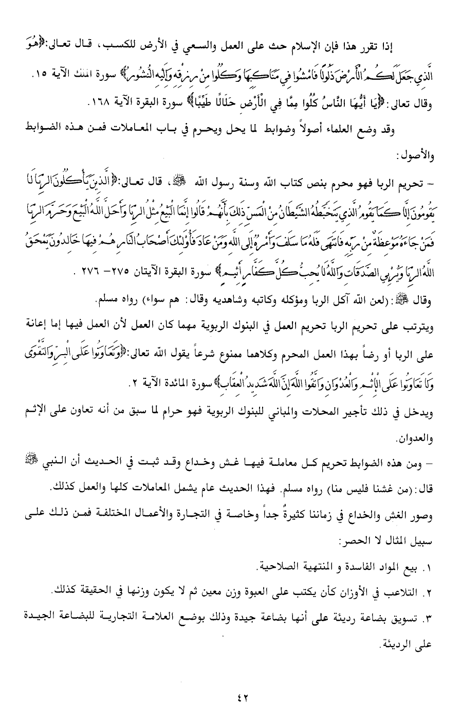 - تحريم الربا فهو محرم بنص كتاب الله وسنة رسول الله - صلى الله عليه وسلم -، قال تعالى: {الَّذِينَ يَأْكُلُونَ الرِّبَا لَا يَقُومُونَ إِلَّا كَمَا يَقُومُ الَّذِي يَتَخَبَّطُهُ الشَّيْطَانُ مِنْ الْمَسِّ ذَلِكَ بِأَنَّهُمْ قَالُوا إِنَّمَا الْبَيْعُ مِثْلُ الرِّبَا وَأَحَلَّ اللَّهُ الْبَيْعَ وَحَرَّمَ الرِّبَا فَمَنْ جَاءَهُ مَوْعِظَةٌ مِنْ رَبِّهِ فَانتَهَى فَلَهُ مَا سَلَفَ وَأَمْرُهُ إِلَى اللَّهِ وَمَنْ عَادَ فَأُوْلَئِكَ أَصْحَابُ النَّارِ هُمْ فِيهَا خَالِدُونَ يَمْحَقُ اللَّهُ الرِّبَا وَيُرْبِي الصَّدَقَاتِ وَاللَّهُ لَا يُحِبُّ كُلَّ كَفَّارٍ أَثِيمٍ} سورة البقرة الآيتان 275 - 276.