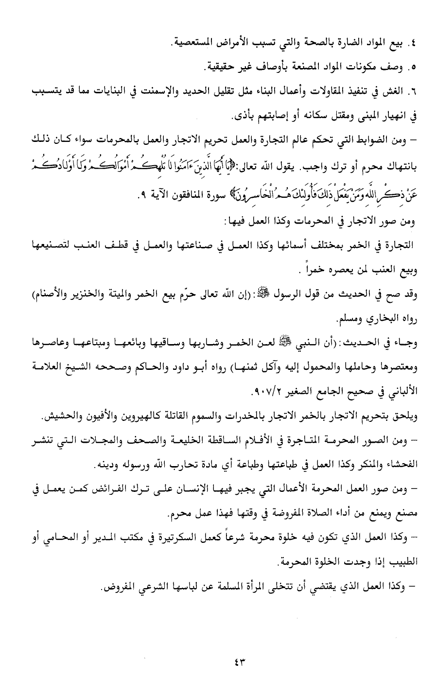 - ومن الضوابط التي تحكم عالم التجارة والعمل تحريم الاتجار والعمل بالمحرمات سواء كان ذلك بانتهاك محرم أو ترك واجب. يقول الله تعالى: {يَا أَيُّهَا الَّذِينَءَامَنُوا لَا تُلْهِكُمْ أَمْوَالُكُمْ وَلَا أَوْلَادُكُمْ عَنْ ذِكْرِ اللَّهِ وَمَنْ يَفْعَلْ ذَلِكَ فَأُولَئِكَ هُمُ الْخَاسِرُونَ} سورة المنافقون الآية 9.