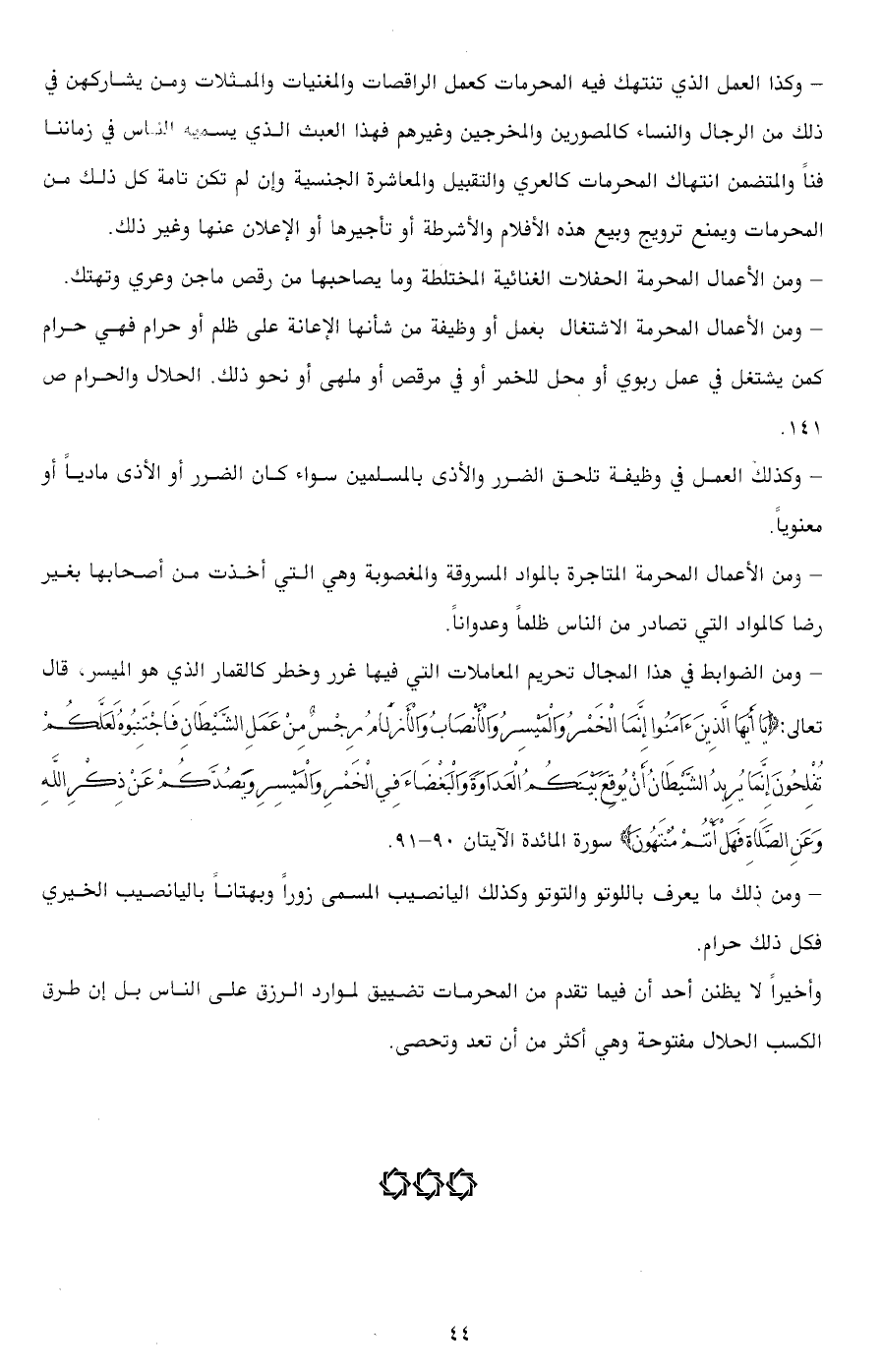 وأخيراً لا يظنن أحد أن فيما تقدم من المحرمات تضييق لموارد الرزق على الناس بل إن طرق الكسب الحلال مفتوحة وهي أكثر من أن تعد وتحصى.