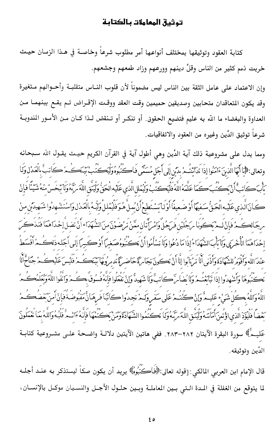 ومما يدل على مشروعية ذلك آية الدَّين وهي أطول آية في القرآن الكريم حيث يقول الله سبحانه وتعالى: {يَا أَيُّهَا الَّذِينَءَامَنُوا إِذَا تَدَايَنْتُمْ بِدَيْنٍ إِلَى أَجَلٍ مُسَمًّى فَاكْتُبُوهُ وَلْيَكْتُبْ بَيْنَكُمْ كَاتِبٌ بِالْعَدْلِ وَلَا يَأْبَ كَاتِبٌ أَنْ يَكْتُبَ كَمَا عَلَّمَهُ اللَّهُ فَلْيَكْتُبْ وَلْيُمْلِلِ الَّذِي عَلَيْهِ الْحَقُّ وَلْيَتَّقِ اللَّهَ رَبَّهُ وَلَا يَبْخَسْ مِنْهُ شَيْئًا فَإِنْ كَانَ الَّذِي عَلَيْهِ الْحَقُّ سَفِيهًا أَوْ ضَعِيفًا أَوْ لَا يَسْتَطِيعُ أَنْ يُمِلَّ هُوَ فَلْيُمْلِلْ وَلِيُّهُ بِالْعَدْلِ وَاسْتَشْهِدُوا شَهِيدَيْنِ مِنْ رِجَالِكُمْ فَإِنْ لَمْ يَكُونَا رَجُلَيْنِ فَرَجُلٌ وَامْرَأَتَانِ مِمَّنْ تَرْضَوْنَ مِنَ الشُّهَدَاءِ أَنْ تَضِلَّ إِحْدَاهُمَا فَتُذَكِّرَ إِحْدَاهُمَا الْأُخْرَى وَلَا يَأْبَ الشُّهَدَاءُ إِذَا مَا دُعُوا وَلَا تَسْأَمُوا أَنْ تَكْتُبُوهُ صَغِيرًا أَوْ كَبِيرًا إِلَى أَجَلِهِ ذَلِكُمْ أَقْسَطُ عِنْدَ اللَّهِ وَأَقْوَمُ لِلشَّهَادَةِ وَأَدْنَى أَلَّا تَرْتَابُوا إِلَّا أَنْ تَكُونَ تِجَارَةً حَاضِرَةً تُدِيرُونَهَا بَيْنَكُمْ فَلَيْسَ عَلَيْكُمْ جُنَاحٌ أَلَّا تَكْتُبُوهَا وَأَشْهِدُوا إِذَا تَبَايَعْتُمْ وَلَا يُضَارَّ كَاتِبٌ وَلَا شَهِيدٌ وَإِنْ تَفْعَلُوا فَإِنَّهُ فُسُوقٌ بِكُمْ وَاتَّقُوا اللَّهَ وَيُعَلِّمُكُمُ اللَّهُ وَاللَّهُ بِكُلِّ شَيْءٍ عَلِيمٌ وَإِنْ كُنْتُمْ عَلَى سَفَرٍ وَلَمْ تَجِدُوا كَاتِبًا فَرِهَانٌ مَقْبُوضَةٌ فَإِنْ أَمِنَ بَعْضُكُمْ بَعْضًا فَلْيُؤَدِّ الَّذِي اؤْتُمِنَ أَمَانَتَهُ وَلْيَتَّقِ اللَّهَ رَبَّهُ وَلَا تَكْتُمُوا الشَّهَادَةَ وَمَنْ يَكْتُمْهَا فَإِنَّهُءَاثِمٌ قَلْبُهُ وَاللَّهُ بِمَا تَعْمَلُونَ عَلِيمٌ} سورة البقرة الآيتان 282 - 283. ففي هاتين الآيتين دلالة واضحة على مشروعية كتابة الدَّين وتوثيقه.