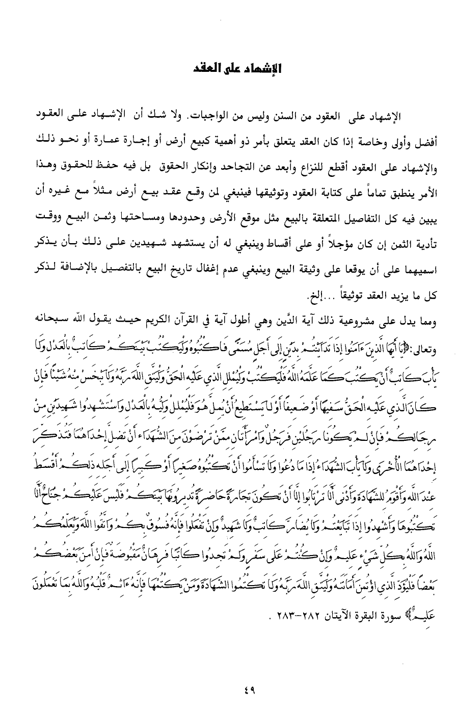 الإشهاد على العقود من السنن وليس من الواجبات. ولا شك أن الإشهاد على العقود أفضل وأولى وخاصة إذا كان العقد يتعلق بأمر ذو أهمية كبيع أرض أو إجارة عمارة أو نحو ذلك والإشهاد على العقود أقطع للنزاع وأبعد عن التجاحد وإنكار الحقوق بل فيه حفظ للحقوق وهذا الأمر ينطبق تماماً على كتابة العقود وتوثيقها فينبغي لمن وقع عقد بيع أرض مثلاً مع غيره أن يبين فيه كل التفاصيل المتعلقة بالبيع مثل موقع الأرض وحدودها ومساحتها وثمن البيع ووقت تأدية الثمن إن كان مؤجلاً أو على أقساط وينبغي له أن يستشهد شهيدين على ذلك بأن يذكر اسميهما على أن يوقعا على وثيقة البيع وينبغي عدم إغفال تاريخ البيع بالتفصيل بالإضافة لذكر كل ما يزيد العقد توثيقاً ... إلخ.