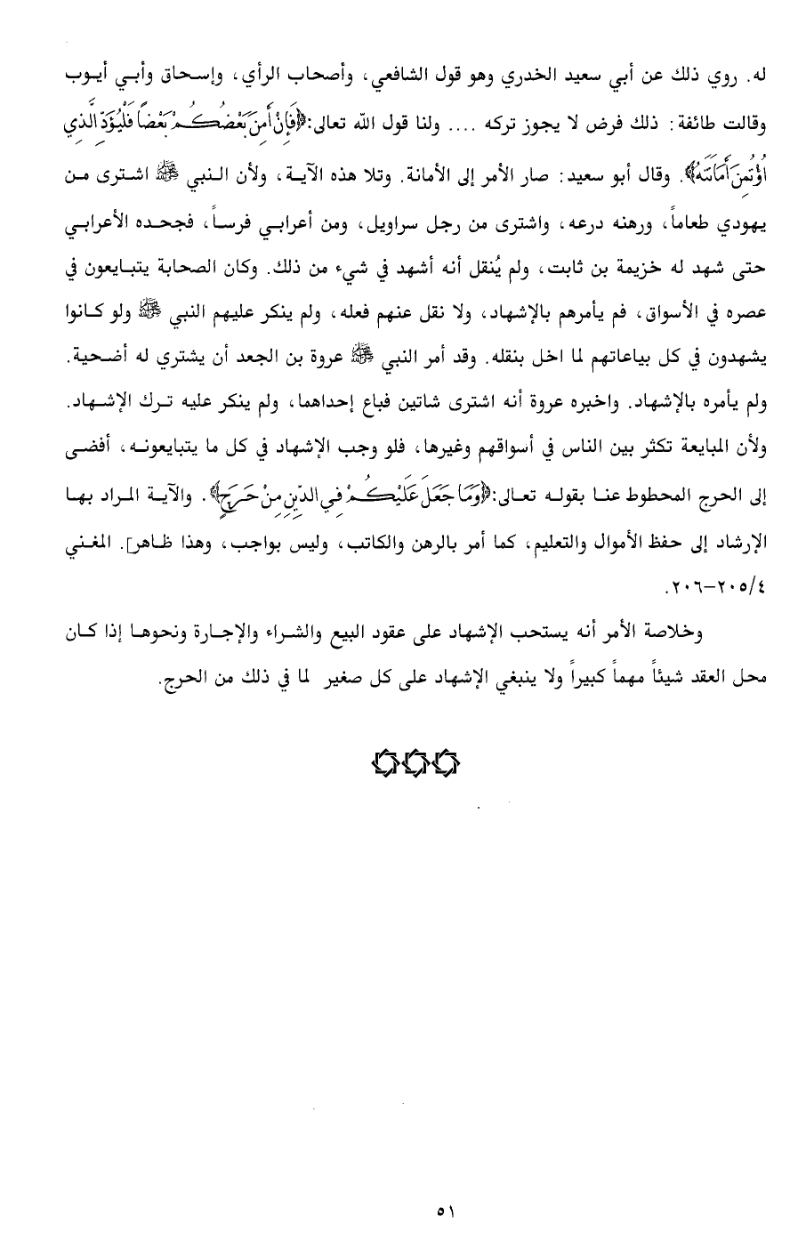 له. روي ذلك عن أبي سعيد الخدري وهو قول الشافعي, وأصحاب الرأي, وإسحاق وأبي أيوب وقالت طائفة: ذلك فرض لا يجوز تركه .... ولنا قول الله تعالى: {فَإِنْ أَمِنَ بَعْضُكُمْ بَعْضًا فَلْيُؤَدِّ الَّذِي اُؤْتُمِنَ أَمَانَتَهُ}. وقال أبو سعيد: صار الأمر إلى الأمانة. وتلا هذه الآية, ولأن النبي - صلى الله عليه وسلم - اشترى من يهودي طعاماً, ورهنه درعه, واشترى من رجل سراويل, ومن أعرابي فرساً, فجحده الأعرابي حتى شهد له خزيمة بن ثابت, ولم يُنقل أنه أشهد في شيء من ذلك. وكان الصحابة يتبايعون في عصره في الأسواق، فم يأمرهم بالإشهاد، ولا نقل عنهم فعله، ولم ينكر عليهم النبي - صلى الله عليه وسلم - ولو كانوا يشهدون في كل بياعاتهم لما اخل بنقله. وقد أمر النبي - صلى الله عليه وسلم - عروة بن الجعد أن يشتري له أضحية. ولم يأمره بالإشهاد. واخبره عروة أنه اشترى شاتين فباع إحداهما، ولم ينكر عليه ترك الإشهاد. ولأن المبايعة تكثر بين الناس في أسواقهم وغيرها، فلو وجب الإشهاد في كل ما يتبايعونه، أفضى إلى الحرج المحطوط عنا بقوله تعالى: {وَمَا جَعَلَ عَلَيْكُمْ فِي الدِّينِ مِنْ حَرَجٍ}. والآية المراد بها الإرشاد إلى حفظ الأموال والتعليم، كما أمر بالرهن والكاتب، وليس بواجب، وهذا ظاهر]. المغني 4/ 205 - 206.
