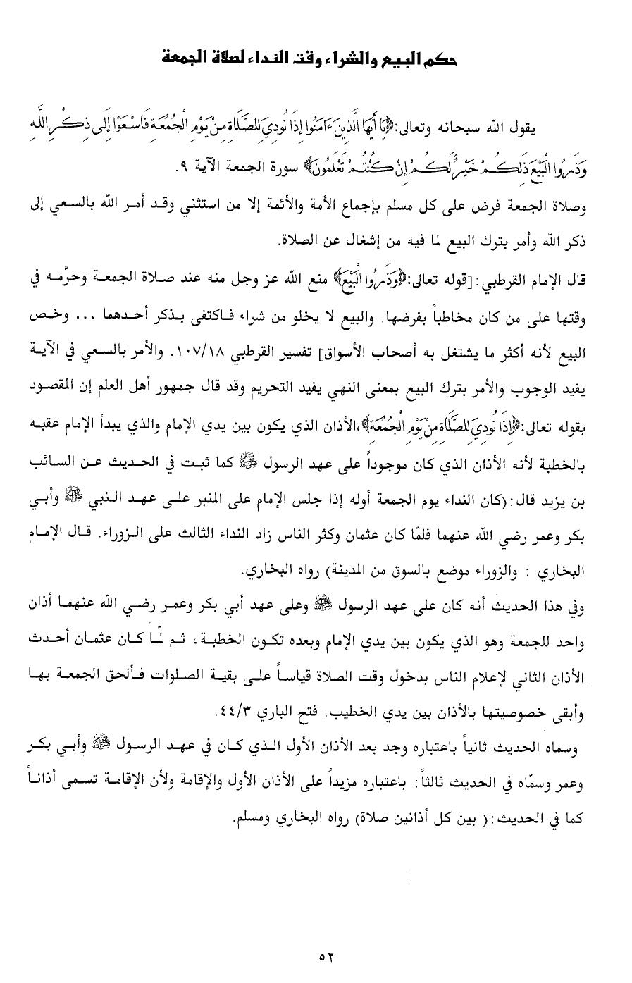 يقول الله سبحانه وتعالى: {يَا أَيُّهَا الَّذِينَءَامَنُوا إِذَا نُودِيَ لِلصَّلَاةِ مِنْ يَوْمِ الْجُمُعَةِ فَاسْعَوْا إِلَى ذِكْرِ اللَّهِ وَذَرُوا الْبَيْعَ ذَلِكُمْ خَيْرٌ لَكُمْ إِنْ كُنْتُمْ تَعْلَمُونَ} سورة الجمعة الآية 9.