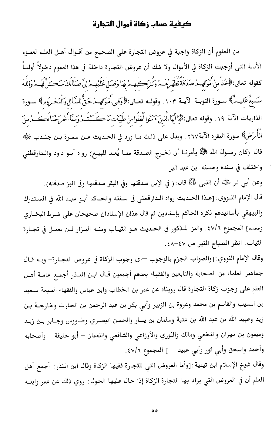 وقال الإمام النووي: [والصواب الجزم بالوجوب -أي وجوب الزكاة في عروض التجارة- وبه قال جماهير العلماء من الصحابة والتابعين والفقهاء بعدهم أجمعين قال ابن المنذر أجمع عامة أهل العلم على وجوب زكاة التجارة قال رويناه عن عمر بن الخطاب وابن عباس والفقهاء السبعة سعيد بن المسيب والقاسم بن محمد وعروة بن الزبير وأبي بكر بن عبد الرحمن بن الحارث وخارجة بن زيد وعبيد الله بن عبد الله بن عتبة وسلمان بن يسار والحسن البصري وطاووس وجابر بن زيد وميمون بن مهران والنخعي ومالك والثوري والأوزاعي والشافعي والنعمان - أبو حنيفة - وأصحابه وأحمد واسحق وأبي ثور وأبي عبيد ... ] المجموع 6/ 47.