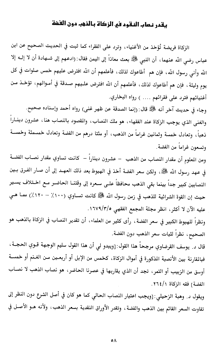 ونظراً للهبوط الكبير في سعر الفضة، رأى كثير من العلماء، أن تقدير النصاب في الزكاة بالذهب هو الصحيح، نظراً لثبات سعر الذهب دون الفضة.
