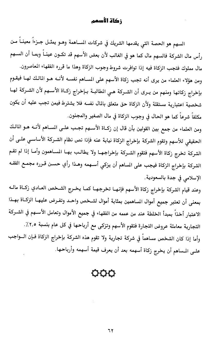 وعند قيام الشركة بإخراج زكاة الأسهم فإنها تخرجها كما يخرج الشخص العادي زكاة ماله بمعنى أن تعتبر جميع أموال المساهمين بمثابة أموال لشخص واحد وتفرض عليها الزكاة بهذا الاعتبار أخذاً بمبدأ الخلطة عند من عممه من الفقهاء في جميع الأموال وتعامل الأسهم في الشركة التجارية معاملة عروض التجارة فتقوم الأسهم وتزكى مع أرباحها في كل عام بنسبة 2. 5%.