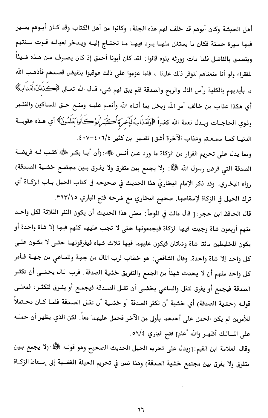 وقال العلامة ابن القيم: [ويدل على تحريم الحيل الحديث الصحيح وهو قوله - صلى الله عليه وسلم -: (لا يجمع بين متفرق ولا يفرق بين مجتمع خشية الصدقة) وهذا نص في تحريم الحيلة المفضية إلى إسقاط الزكاة