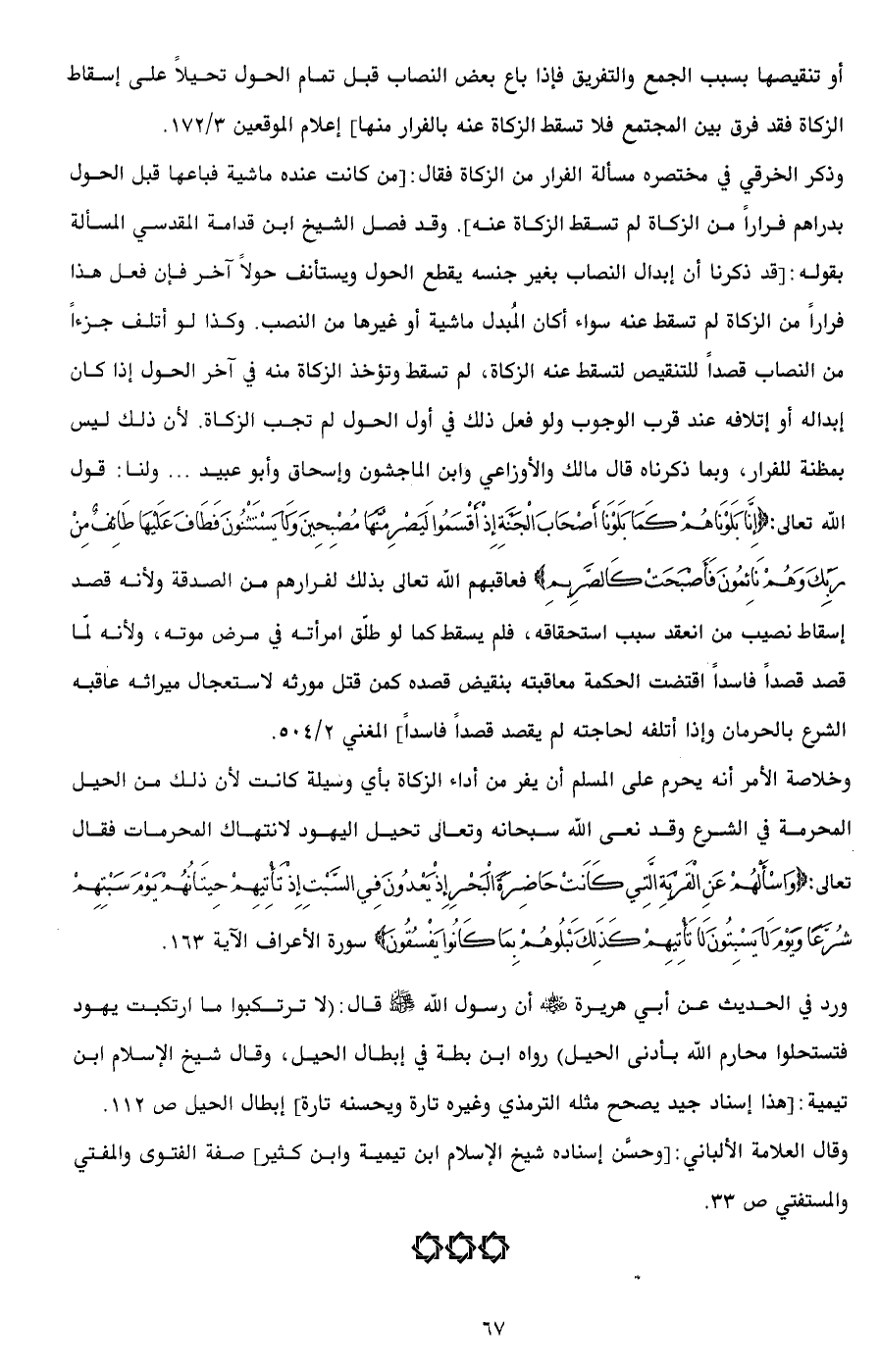 وخلاصة الأمر أنه يحرم على المسلم أن يفر من أداء الزكاة بأي وسيلة كانت لأن ذلك من الحيل المحرمة في الشرع وقد نعى الله سبحانه وتعالى تحيل اليهود لانتهاك المحرمات فقال تعالى: {وَاسْأَلْهُمْ عَنِ الْقَرْيَةِ الَّتِي كَانَتْ حَاضِرَةَ الْبَحْرِ إِذْ يَعْدُونَ فِي السَّبْتِ إِذْ تَأْتِيهِمْ حِيتَانُهُمْ يَوْمَ سَبْتِهِمْ شُرَّعًا وَيَوْمَ لَا يَسْبِتُونَ لَا تَأْتِيهِمْ كَذَلِكَ نَبْلُوهُمْ بِمَا كَانُوا يَفْسُقُونَ} سورة الأعراف الآية 163.