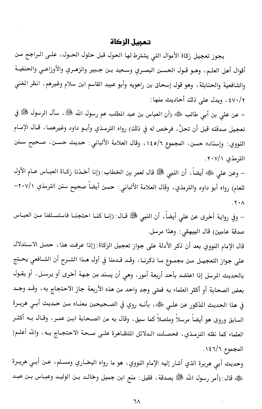 - عن علي بن أبي طالب - رضي الله عنه - (أن العباس بن عبد المطلب عم رسول الله - صلى الله عليه وسلم -، سأل الرسول - صلى الله عليه وسلم - في تعجيل صدقته قبل أن تحلَّ، فرخص له في ذلك) رواه الترمذي وأبو داود وغيرهما، قال الإمام النووي: وإسناده حسن، المجموع 6/ 145، وقال العلامة الألباني: حديث حسن، صحيح سنن الترمذي 1/ 207.