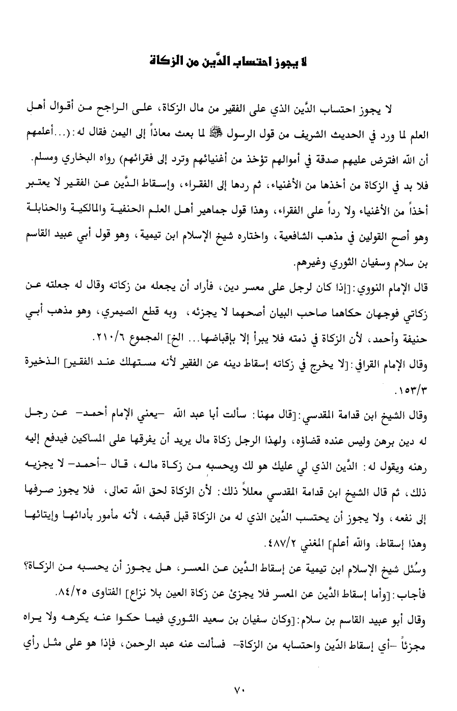 وقال الشيخ ابن قدامة المقدسي: [قال مهنا: سألت أبا عبد الله -يعني الإمام أحمد- عن رجل له دين برهن وليس عنده قضاؤه، ولهذا الرجل زكاة مال يريد أن يفرقها على المساكين فيدفع إليه رهنه ويقول له: الدَّين الذي لي عليك هو لك ويحسبه من زكاة ماله، قال -أحمد- لا يجزيه ذلك، ثم قال الشيخ ابن قدامة المقدسي معللاً ذلك: لأن الزكاة لحق الله تعالى، فلا يجوز صرفها إلى نفعه، ولا يجوز أن يحتسب الدَّين الذي له من الزكاة قبل قبضه، لأنه مأمور بأدائها وإيتائها وهذا إسقاط، والله أعلم] المغني 2/ 487.