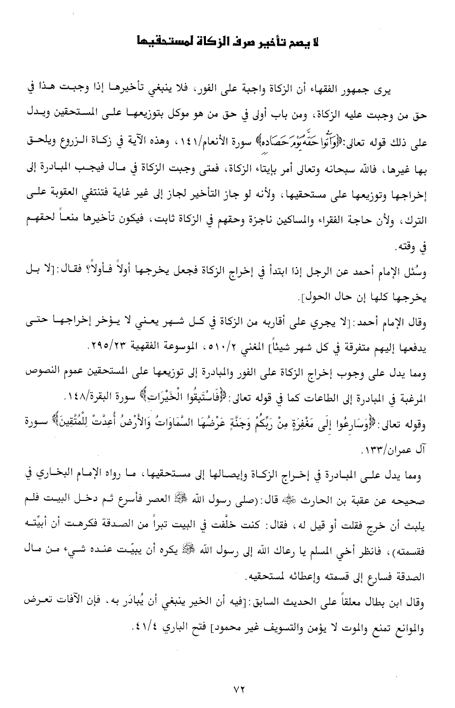 ومما يدل على وجوب إخراج الزكاة على الفور والمبادرة إلى توزيعها على المستحقين عموم النصوص المرغبة في المبادرة إلى الطاعات كما في قوله تعالى: {فَاسْتَبِقُوا الْخَيْرَاتِ} سورة البقرة/148.