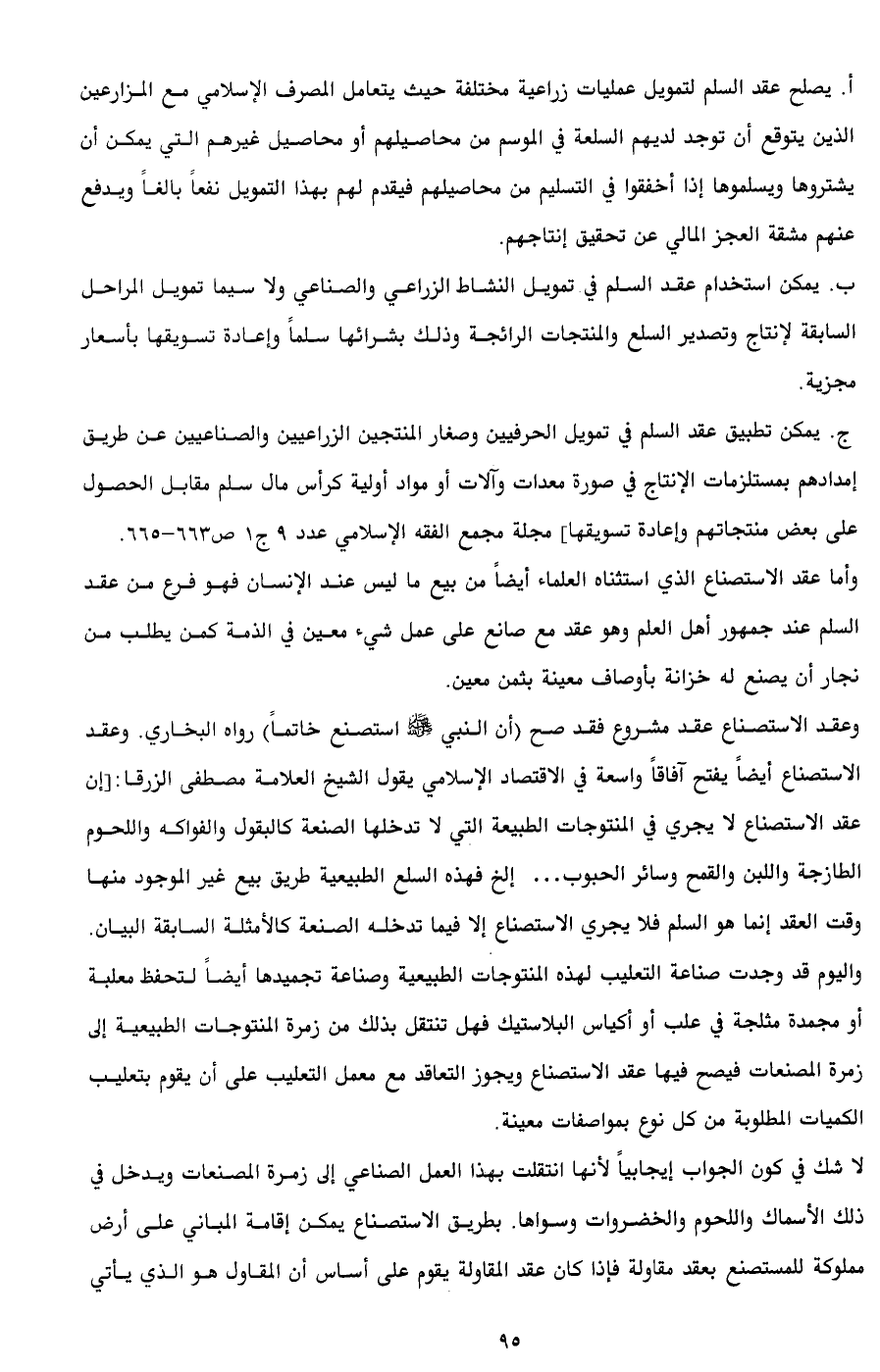 ج. يمكن تطبيق عقد السلم في تمويل الحرفيين وصغار المنتجين الزراعيين والصناعيين عن طريق إمدادهم بمستلزمات الإنتاج في صورة معدات وآلات أو مواد أولية كرأس مال سلم مقابل الحصول على بعض منتجاتهم وإعادة تسويقها] مجلة مجمع الفقه الإسلامي عدد 9 ج1 ص663 - 665.
